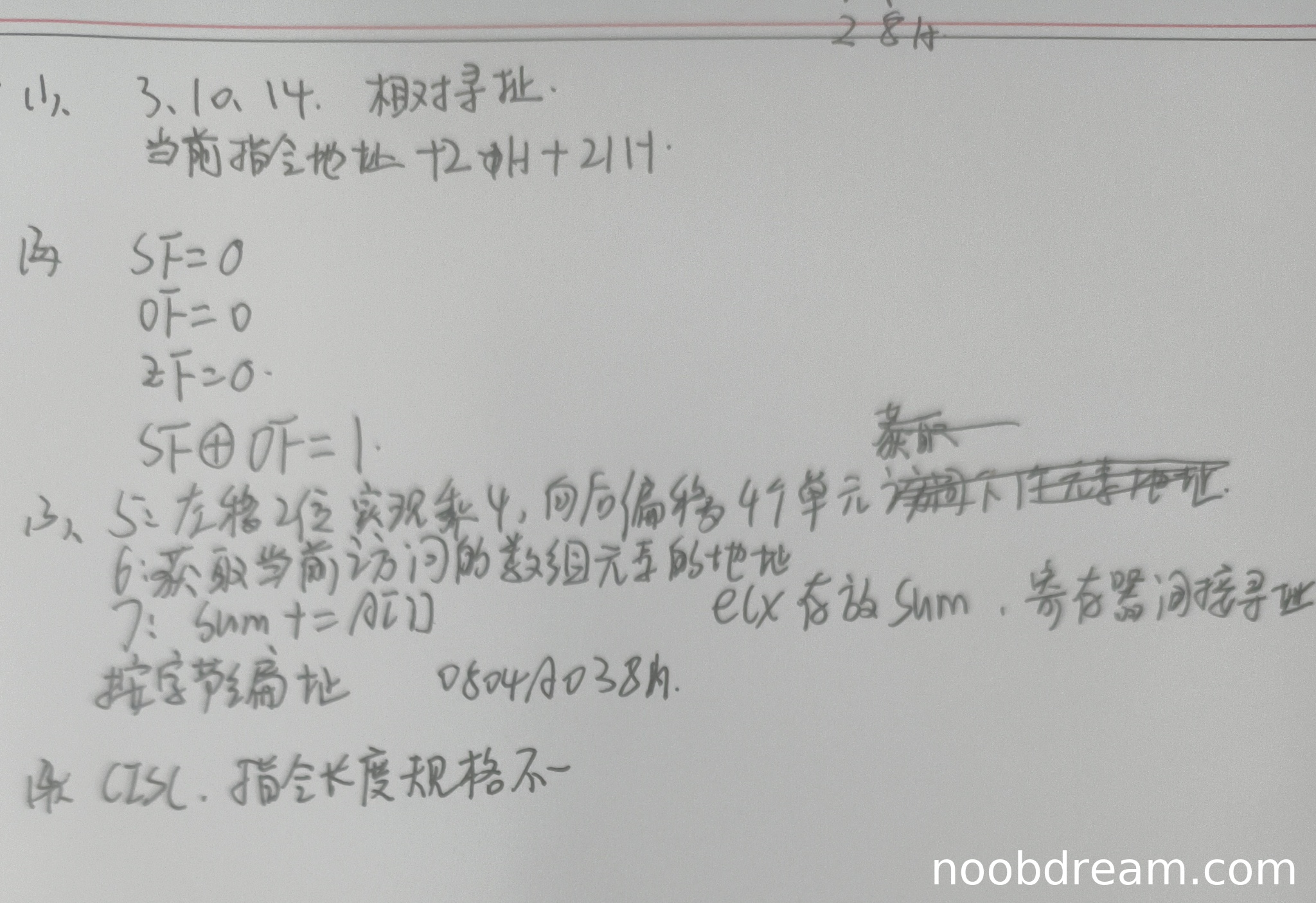 学生正确分析了指令5功能(左移2位实现乘4,得1分)、指令6功能(获取数组元素地址,得1分)、指令7功能(Sum += A[i],但ecx存储内容描述不准确,应为A[i]的值而非Sum;得1分部分分)。正确指出寻址方式为寄存器间接寻址(得1分)、编址方式为按字节编址(得1分)。正确计算A[10]地址为0804A038H(得1分)。但指令7功能描述有误(ecx存储A[i]值,但学生说“ecx存放Sum”),存在逻辑错误,扣1分。