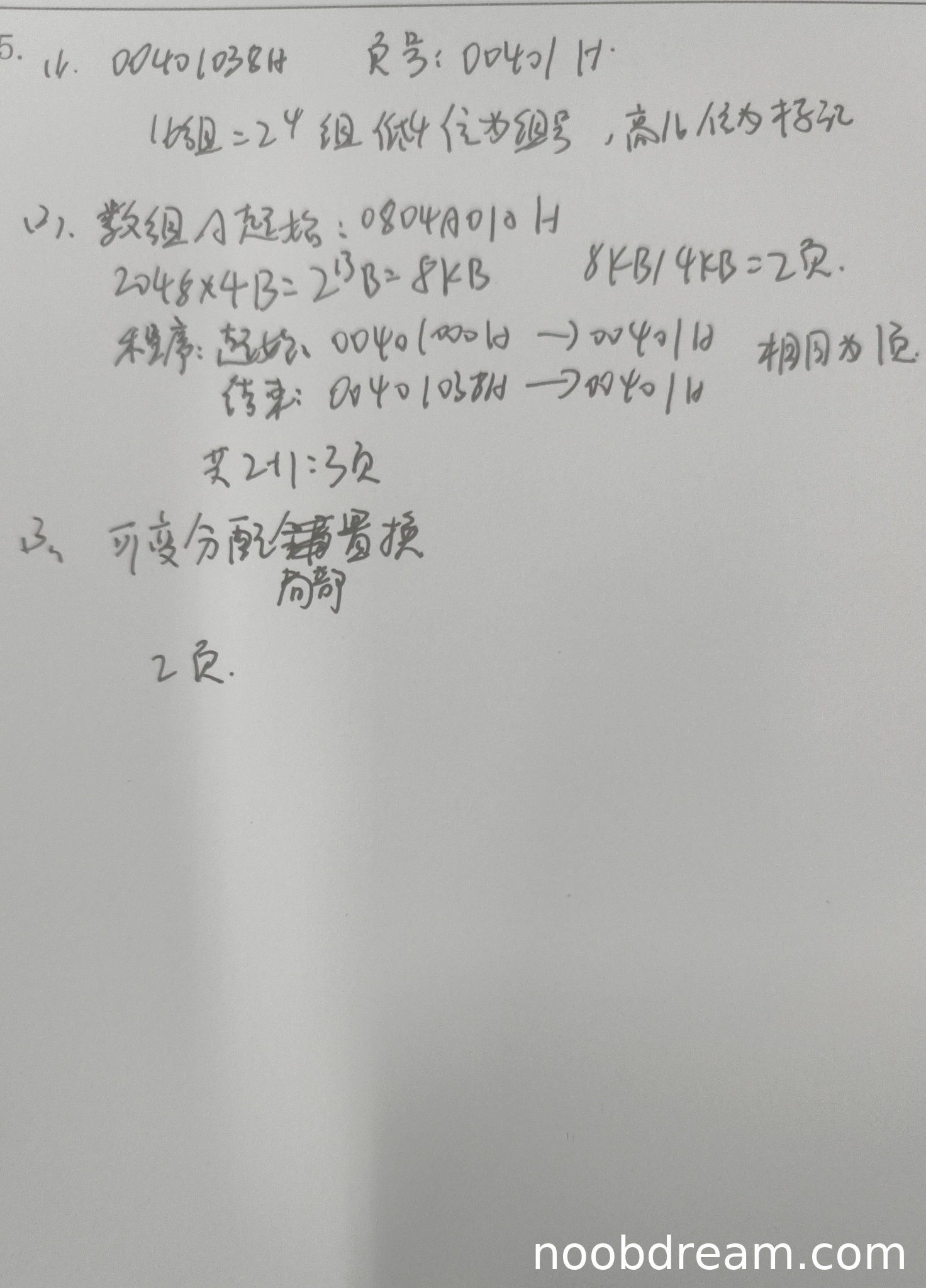 学生正确计算了数组A的大小(2048×4B=8KB)和所占页数(8KB/4KB=2页),但错误地认为程序指令部分(虚拟地址00401000H~00401040H)占1页(实际应为1页,但学生写“相同为原”或“相同为1页”意思正确)。然而,学生最终得出总页面数为3页(指令1页+数组2页),但标准答案要求的是“至少需要访问的虚拟页面数”,即指令和数组访问中涉及的虚拟页面总数(1+3=4页),学生错误地计算为3页(2+1),且未考虑数组实际跨越3页(起始0804A010H,结束0804C010H,涉及0804A、0804B、0804C三个页号)。因此,计算过程有逻辑错误。扣2分,得1分(仅正确计算了数组大小和页数,但总页面数错误)。