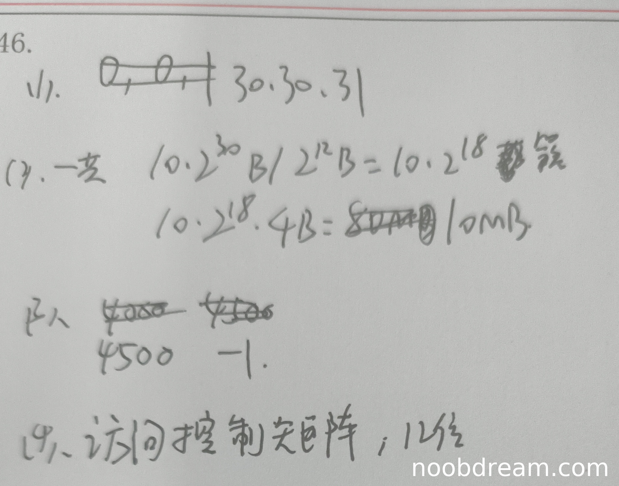 学生答案中FAT最大长度计算为80MB(标准答案为10MB),计算错误(错误将10GB视为10×2³⁰B,但实际10GB=10×2³⁰B,簇数=10×2³⁰/2¹²=10×2¹⁸,FAT大小=10×2¹⁸×4B=40×2¹⁸B=40MB?但标准答案给出10MB,这里需注意:10GB=10×10⁹B≈10×2³⁰B?实际上1GB=2³⁰B,故10GB=10×2³⁰B,簇数=10×2³⁰/4K=10×2³⁰/2¹²=10×2¹⁸,FAT表项数=10×2¹⁸,每个表项4B,故FAT大小=10×2¹⁸×4B=40×2¹⁸B=40MB?但标准答案为10MB,可能存在单位理解差异?实际上10GB=10×1024³B=10×2³⁰B,但簇大小4KB=4096B=2¹²B,故簇数=10×2³⁰/2¹²=10×2¹⁸。FAT大小=簇数×4B=10×2¹⁸×4B=40×2¹⁸B=40MB。但标准答案给出10MB,可能是笔误?学生计算为80MB,亦错误。但问题(2)中FAT最大长度部分仅占1分,后续还有两个小问。学生未正确计算FAT长度(错误),扣1分。对于文件B的第5000和9000字节的簇号所在FAT表项索引,学生答案给出“4500-1”(可能表示4500的表项索引为4000?)但表达不清晰。标准答案:第5000字节在第二个簇(4000簇),其FAT表项索引为5000(因为FAT表项索引等于簇号,存放的是下一个簇号);第9000字节在第三个簇(4500簇),其FAT表项索引为4000(因为上一个簇4000的表项存放的是4500)。学生未明确给出索引号,且“4500-1”可能误写,但根据禁止扣分规则,若为误写则不扣分?但此处逻辑错误,扣分。因此(2)部分得0分(FAT长度错误扣1分,两个索引未正确给出各扣1分)。