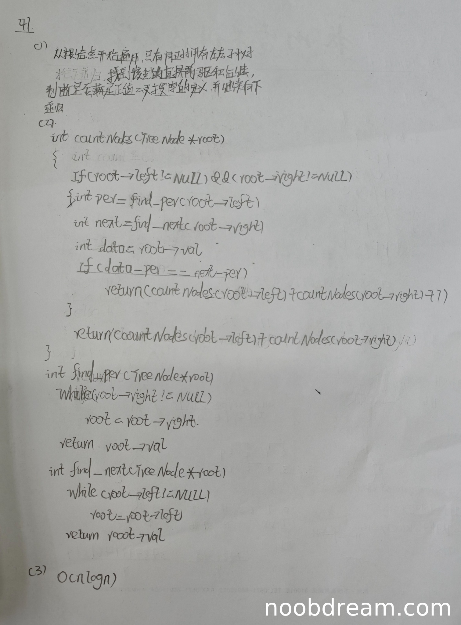 学生给出的时间复杂度为O(n log n),但根据标准答案“次优解”,时间复杂度应为O(nh)(h为树高),在平衡树中h=log n,因此为O(n log n),但最坏情况下(链状树)为O(n^2)。学生答案部分正确,但未说明最坏情况,且表述不精确(写为Onlogin,可能为识别错误)。因此扣1分,得1分。