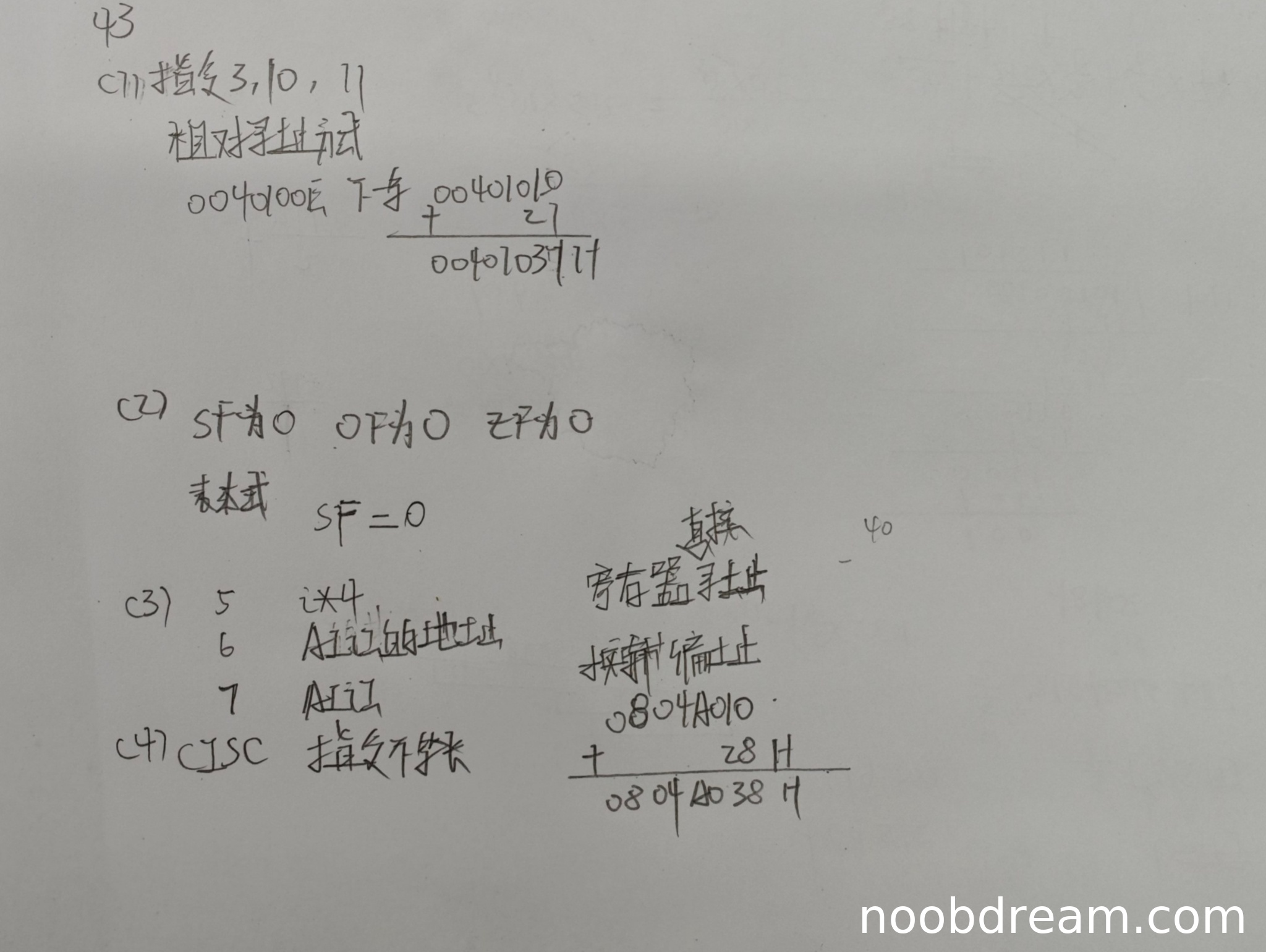 学生答出了指令5的功能(i×4),但寻址方式描述错误(应为寄存器寻址,但学生写了“直接”或未明确),扣0.5分;指令6的功能描述部分正确(计算地址),但寻址方式错误(应为立即数寻址,学生写了“寄存器寻址”或“变址寻址”),扣0.5分;指令7的功能描述正确(读取A[i]),但寻址方式错误(应为寄存器间接寻址,学生写了“变址+偏址”或未明确),扣0.5分;ecx内容答对(A[i]),得1分;编址方式未明确答出(按字节编址),扣1分;A[10]地址计算正确(0804A038H),得1分。本小题得分为:0.5(指令5)+0.5(指令6)+0.5(指令7)+1(ecx)+0(编址方式)+1(地址计算)=3.5分。
