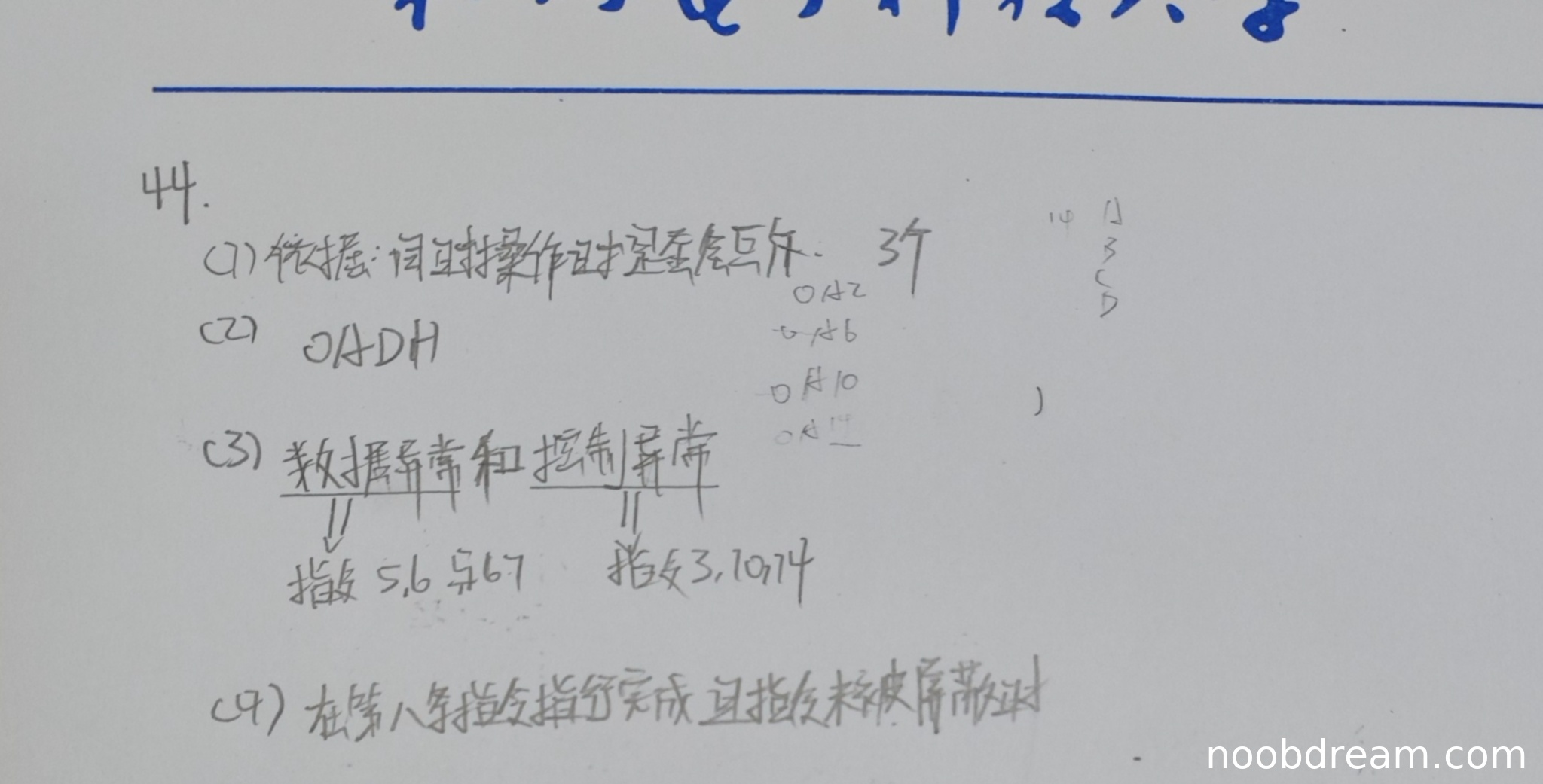 学生回答异常类型为"数据异常和控制异常",但标准答案为缺页异常和溢出异常。学生未正确列出具体异常类型,且指令编号识别混乱(如"指数5,6567"等),存在逻辑错误。因此得0分。