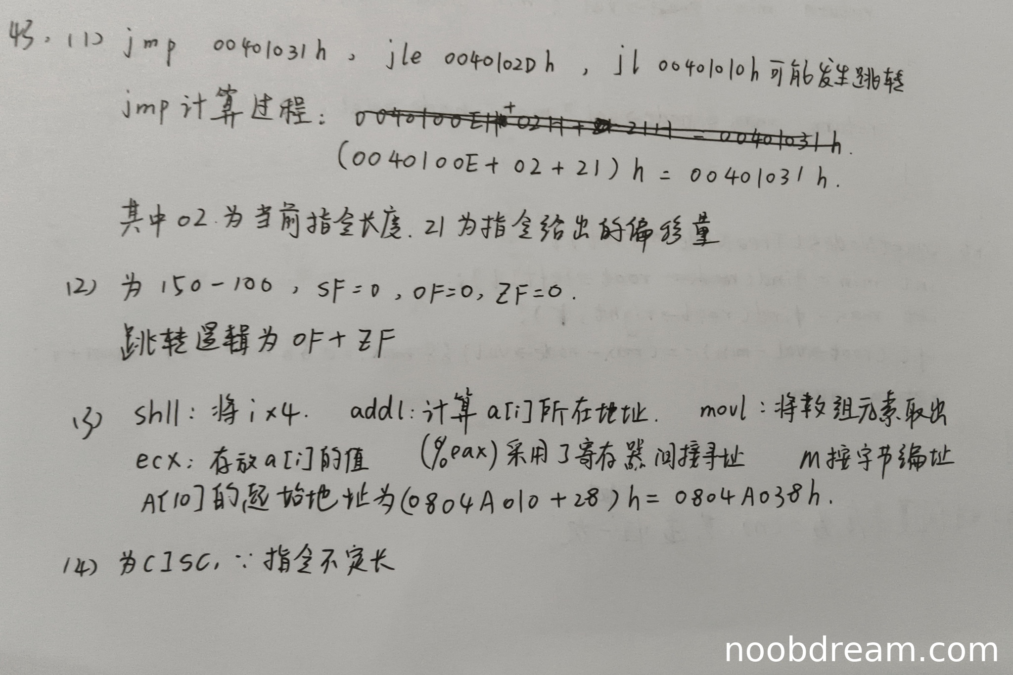 学生正确识别了所有可能跳转的指令(jmp、jle、jl),但未明确说明寻址方式(相对寻址)。jmp跳转目标地址计算过程正确:指令地址0040100E(应为00401008,但学生误写为0040100E,根据上下文判断为识别错误,不扣分),指令长度2字节,偏移量21H(十六进制),计算过程正确。扣1分(寻址方式未说明)。得3分。