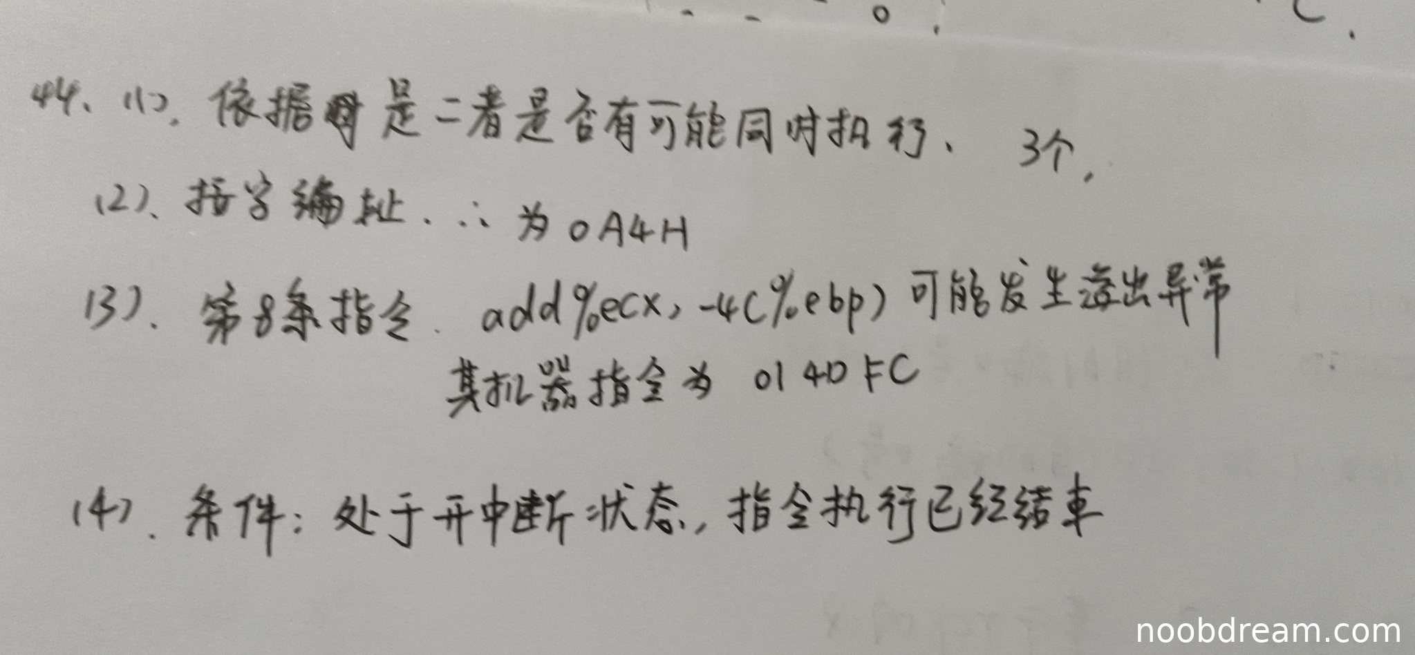 学生回答“处于开中断状态,指令执行已经结束”,这与标准答案中“CPU处于开中断状态”和“当前addl指令执行完成后”一致(2分)。但学生未提及“中断请求未被屏蔽”这一条件,标准答案明确要求。因此扣1分,得1分。