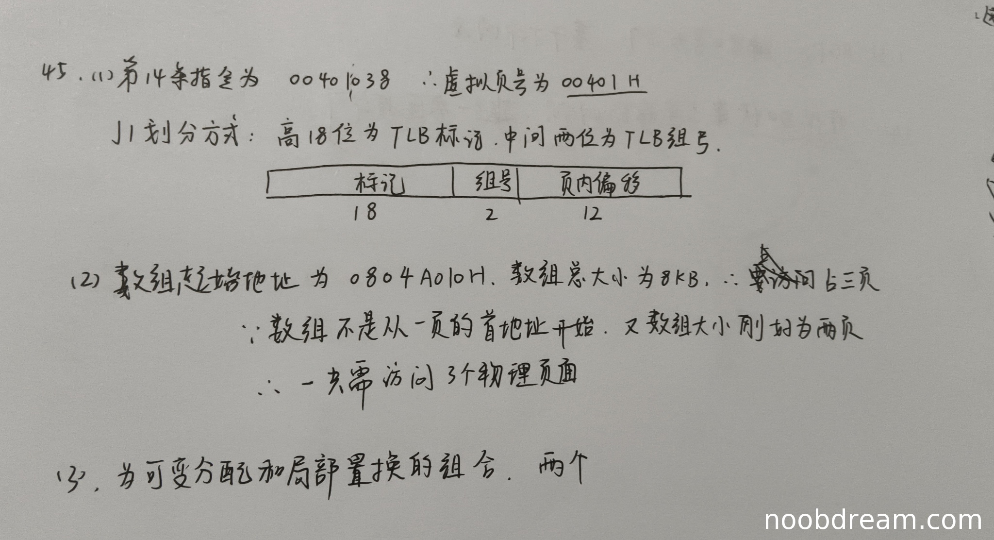 学生正确给出了虚拟页号00401H(十六进制),得1分。但TLB标记和组号划分错误:标准答案应为虚页号高16位为标记,低4位为组号(因为TLB有16组,需要4位组号);学生回答为高18位标记、中间2位组号,这是错误的。由于存在逻辑错误,扣1分。最终得1分。