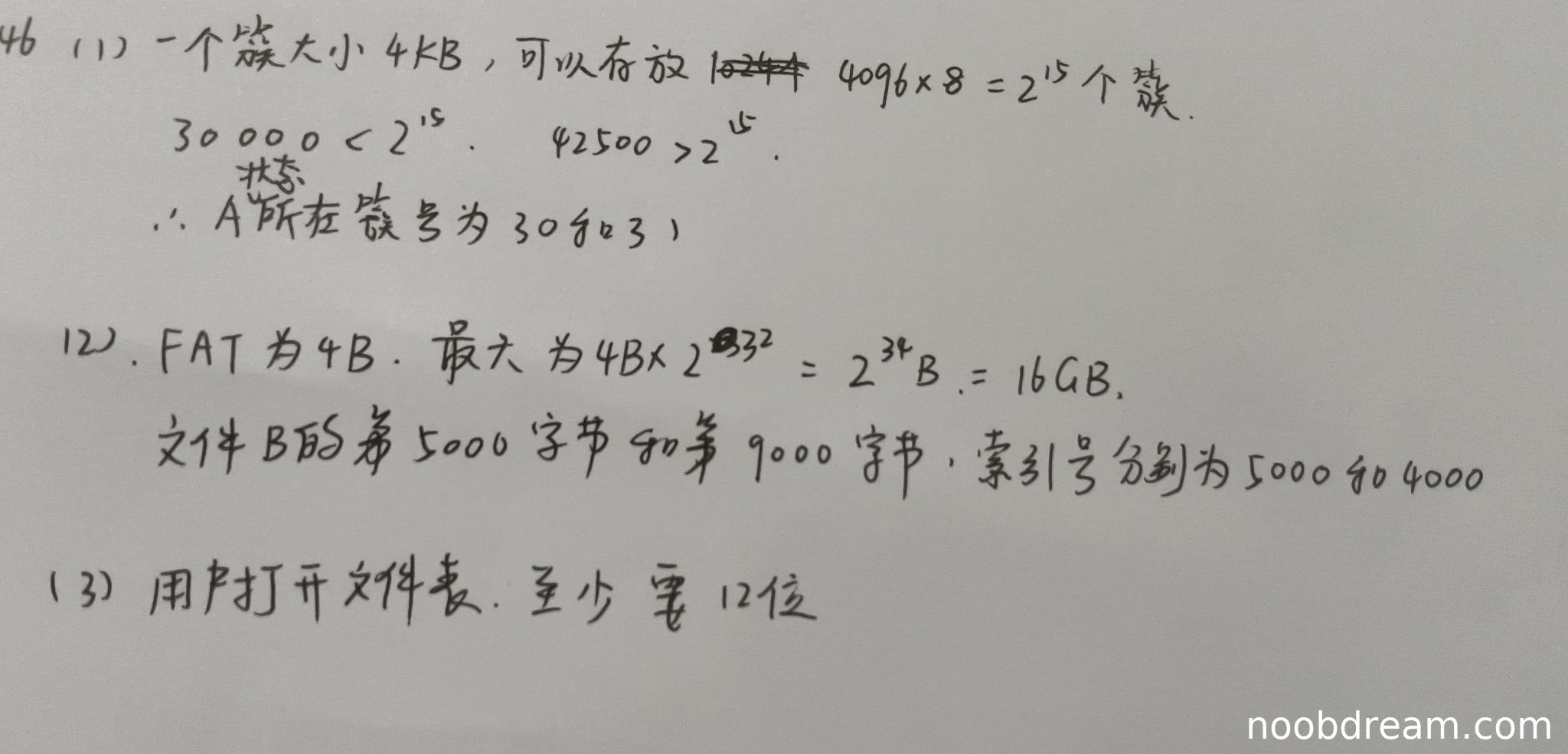 学生回答“A所在簇号为30和31”,但未明确说明每个簇的状态位所在簇号,且计算过程不完整(如未给出具体簇号对应的位图簇号计算)。标准答案要求分别计算30000、32000、42500簇的状态位所在簇号(30、30、31)。学生回答过于简略,未体现完整计算过程,但提到了30和31,部分正确。因此扣1分,得2分。