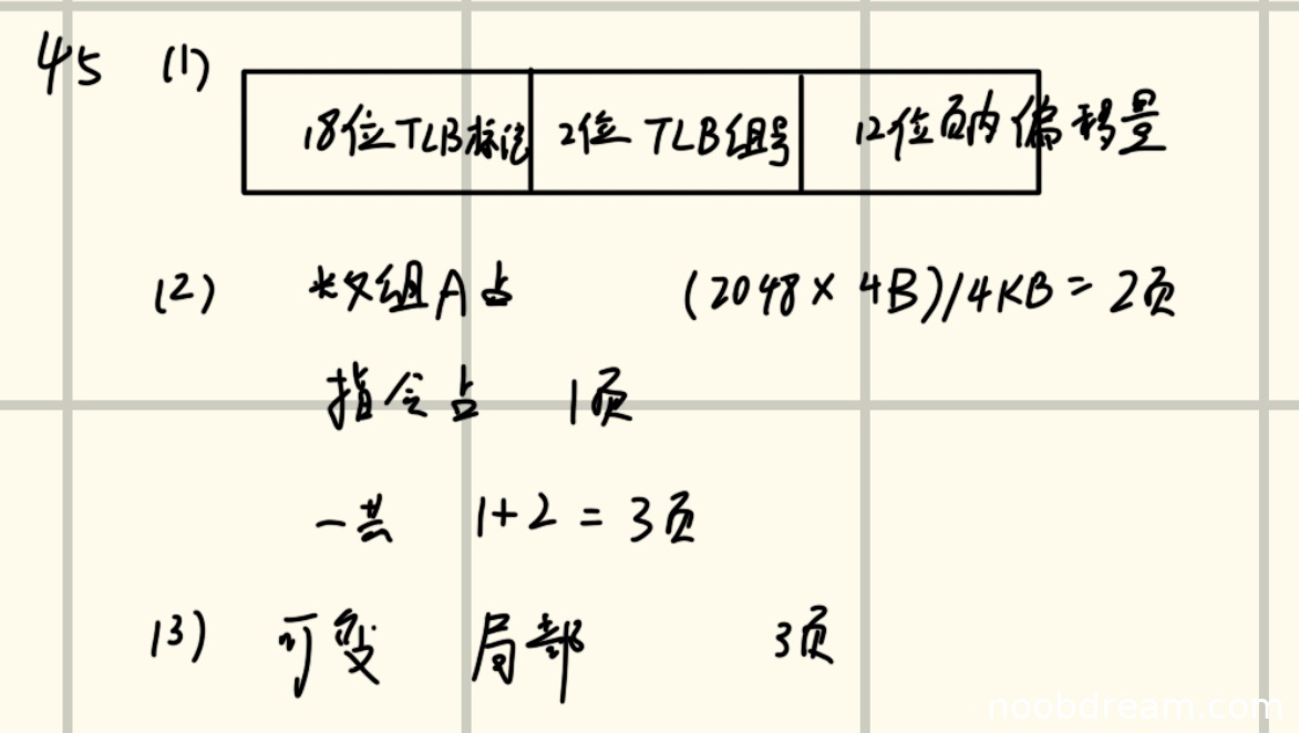 学生答案中给出TLB标记为18位,组号为2位,页内偏移为12位。但根据标准答案,虚页号共20位,TLB组号应为4位(因为16组需log2(16)=4位),标记应为16位(20-4=16)。学生答案中组号2位错误,标记18位错误,但页内偏移12位正确。由于核心逻辑错误(组号和标记位数计算错误),扣2分。得0分。