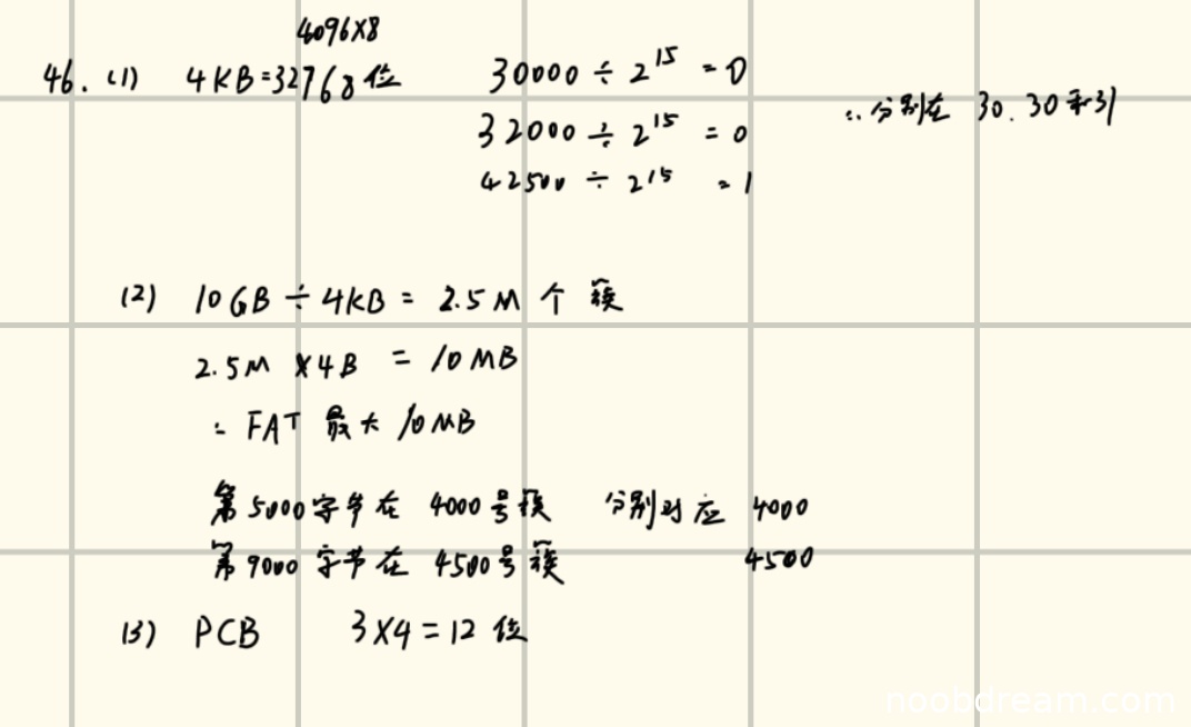 学生答案:计算了每个簇在位图中的位置,正确得出30000和32000簇在位图簇30中,42500簇在位图簇31中。计算过程正确,结果与标准答案一致。得3分。