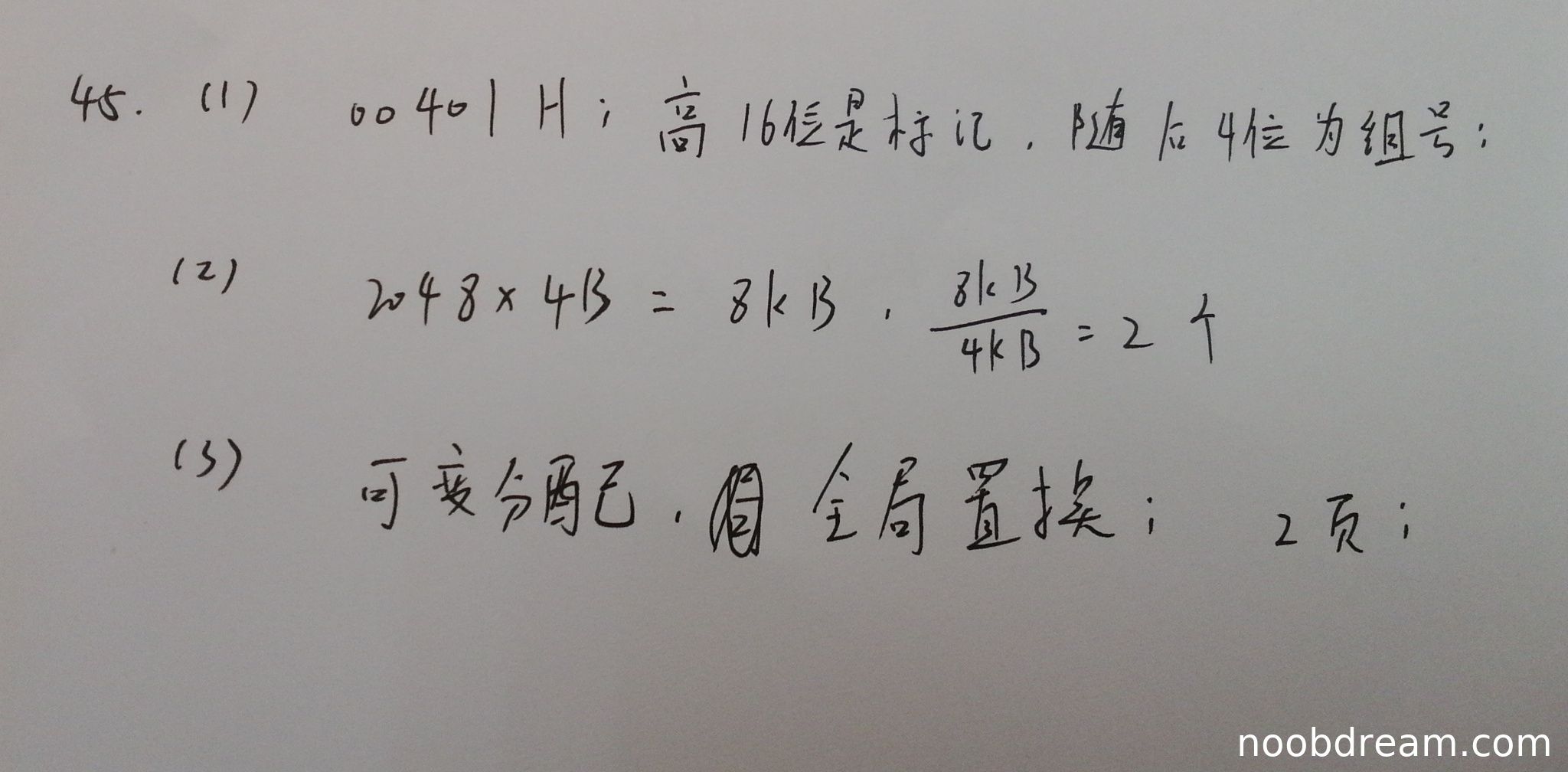 学生答案正确给出了虚拟页号为00401H,并正确指出高16位为TLB标记,随后4位为组号(即低4位为组号)。与标准答案完全一致。得2分。
