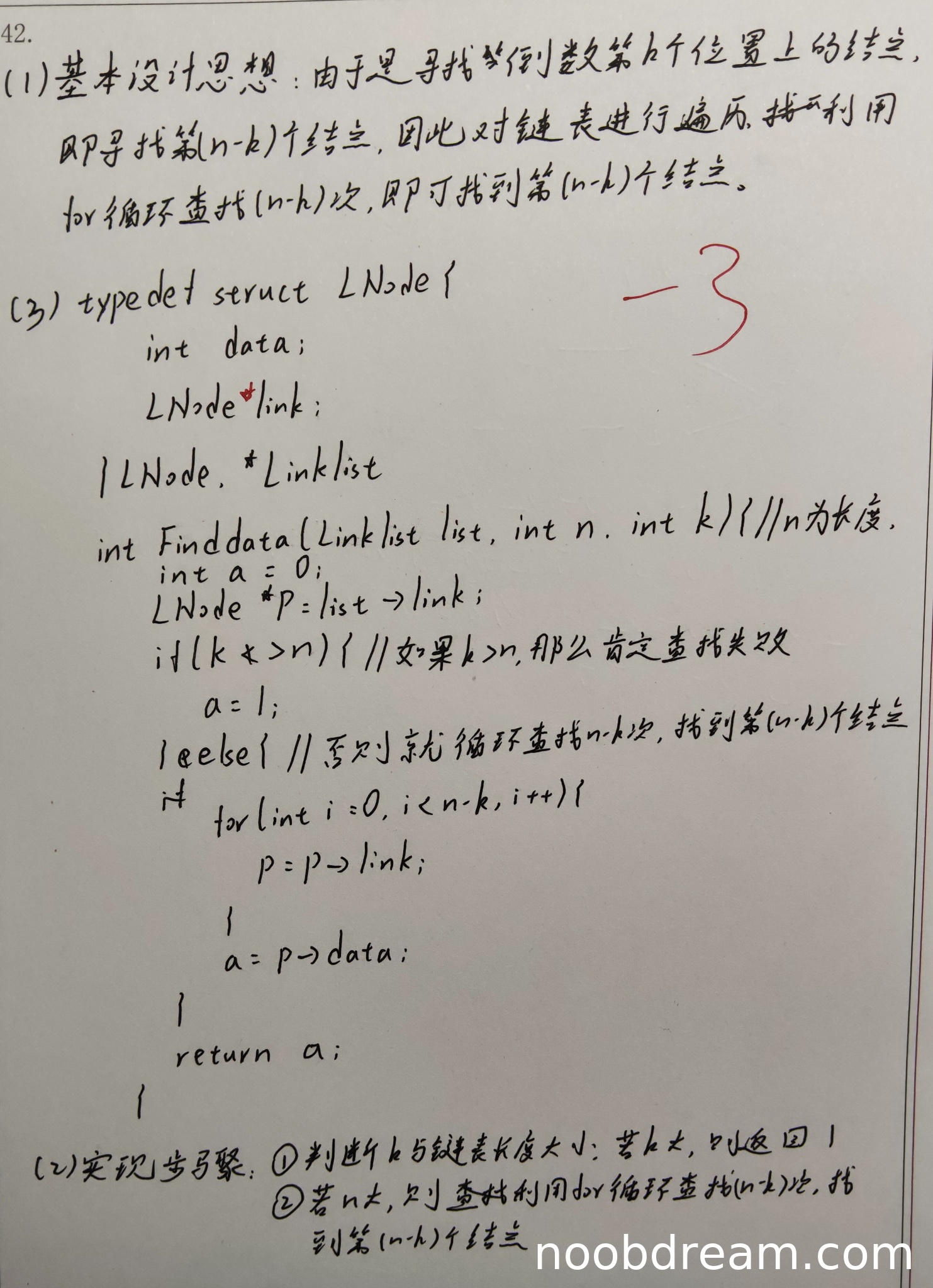 得0分。学生的基本设计思想是通过计算链表长度n,然后找到第(n-k)个结点。这种方法需要先遍历链表获取长度n,然后再遍历一次找到第(n-k)个结点,总共需要两遍扫描。而题目要求“尽可能高效的算法”,且标准答案要求一趟扫描。学生的思路不符合高效要求,且没有使用双指针的一趟扫描方法,因此不得分。