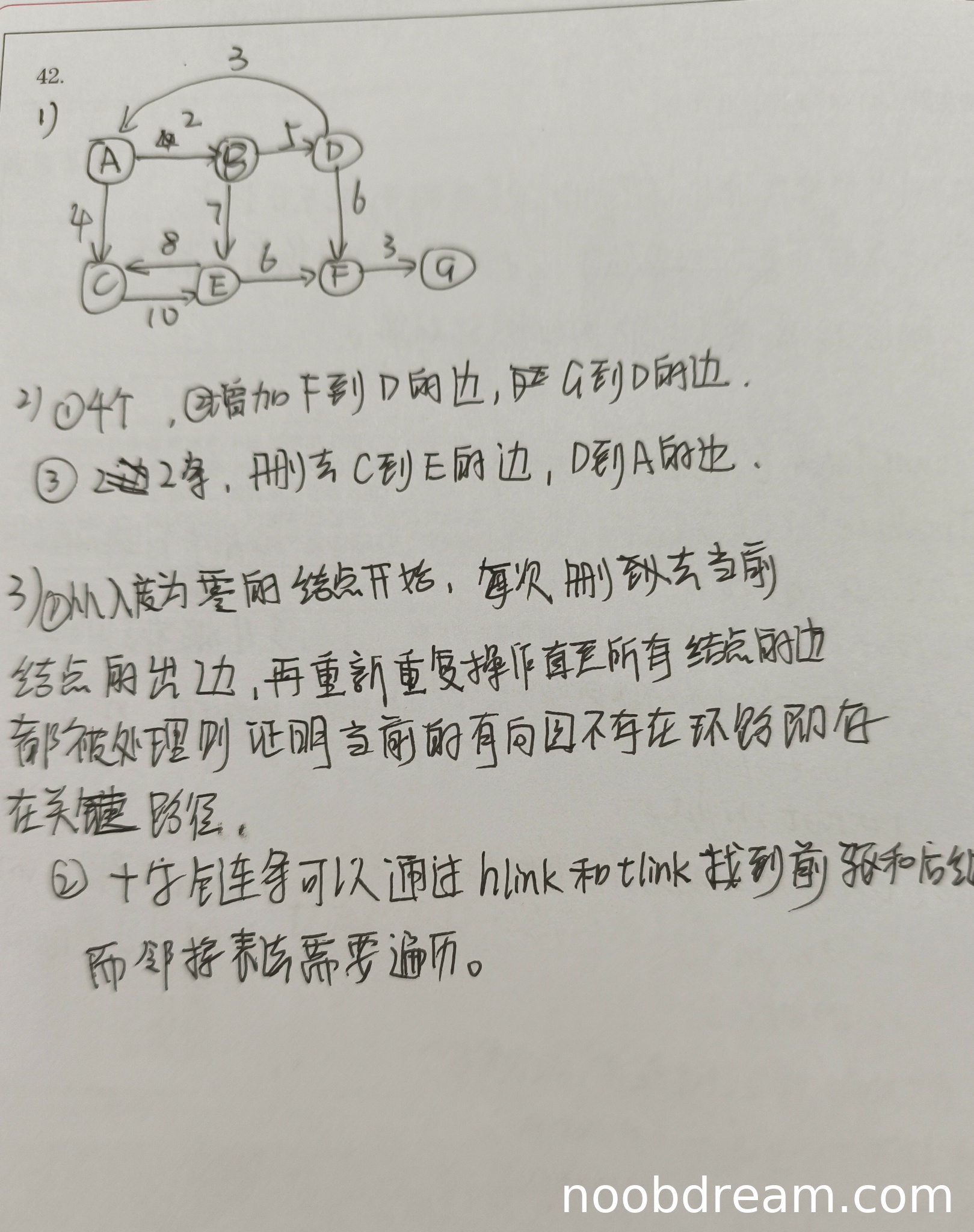 学生回答强连通分量数量为4个,与标准答案一致(1分)。但添加边部分,学生提出添加F到D和G到D两条边,而标准答案要求最少添加一条边(例如G到D),学生方案非最优且未说明"至少"添加一条边,因此不得分(0分)。删除边部分,学生提出删除C到E和D到A两条边,与标准答案一致(1分)。本问总计得分:1+0+1=2分。