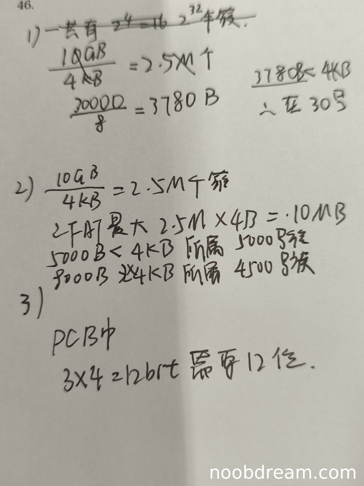 学生第一次识别结果中计算了位图管理方式下状态位所在的簇号,但计算过程有误(如“一共有 \(2^4 = 16\) 个簇”错误,实际应为每簇存储位数 \(4KB \times 8 = 32K\) 位),且未分别计算三个簇(30000、32000、42500)的状态位位置。第二次识别结果类似。但学生最终结论“在30号”部分正确(仅适用于30000和32000簇,但未提及42500簇在31号)。根据标准答案,需分别计算三个簇的状态位簇号,学生仅给出一个结果且未覆盖全部,因此扣分。得分:1分(部分正确)。