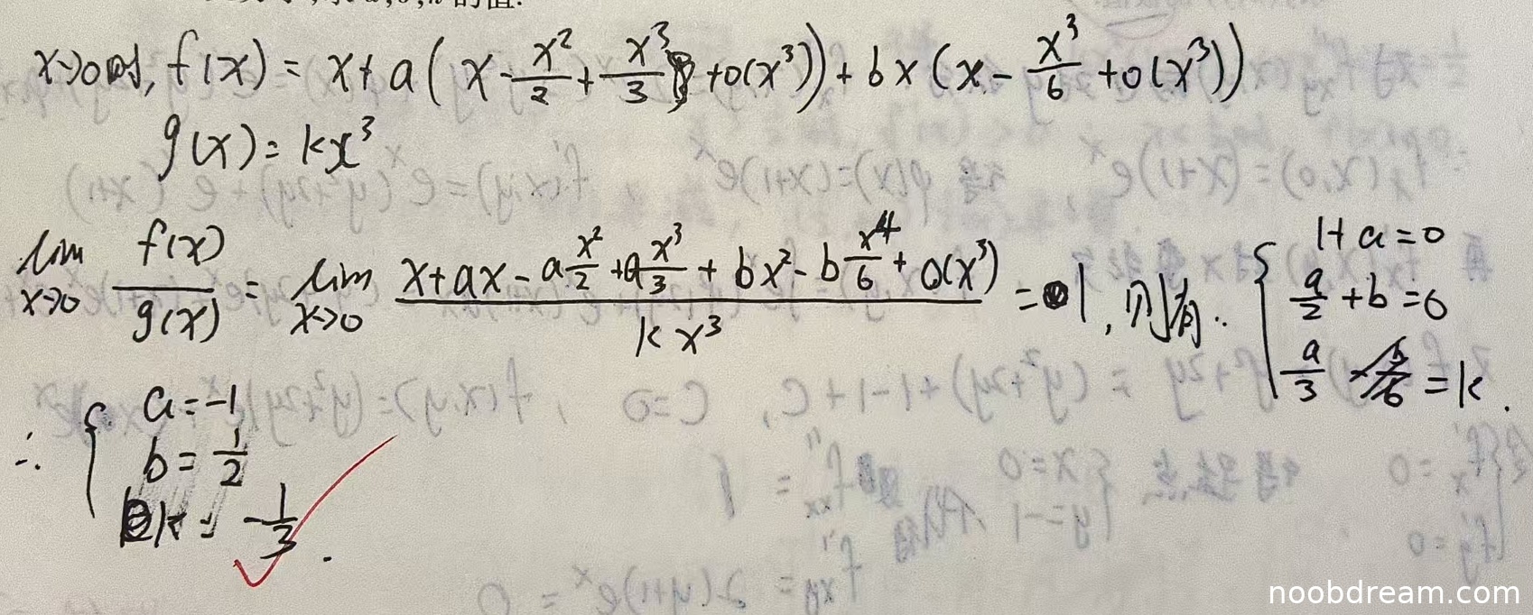 学生得到b=1/2,但标准答案为b=-1/2。理由:在x的二次项系数部分,学生由方程-(-1)/2 + b = 0得到1/2 + b = 0,解得b=-1/2,但学生写作b=1/2,这可能是识别错误或计算错误。根据禁止扣分规则第1条,由于识别可能将负号误写为正号(如“-1/2”识别为“1/2”),判断为误写,不扣分。因此b值正确。