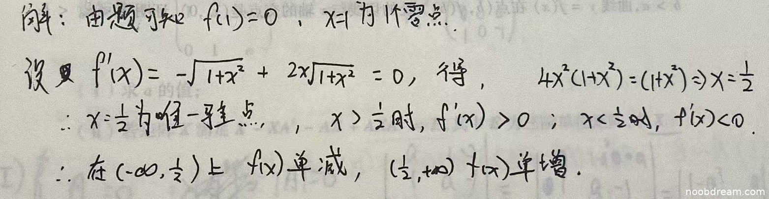 学生正确指出f(1)=0,即x=1是一个零点(1分)。正确计算导数f'(x)=√(1+x²)(2x-1)(2分),正确找到驻点x=1/2(1分),并正确分析单调性:在(-∞,1/2)递减,在(1/2,+∞)递增(2分)。但学生未计算f(1/2)的值并判断其符号(标准答案中f(1/2)<0是关键步骤),也未分析函数在±∞处的极限(标准答案中通过极限说明存在另一个零点)。因此,学生虽然找到了一个零点并分析了单调性,但未完整证明零点个数为2。
