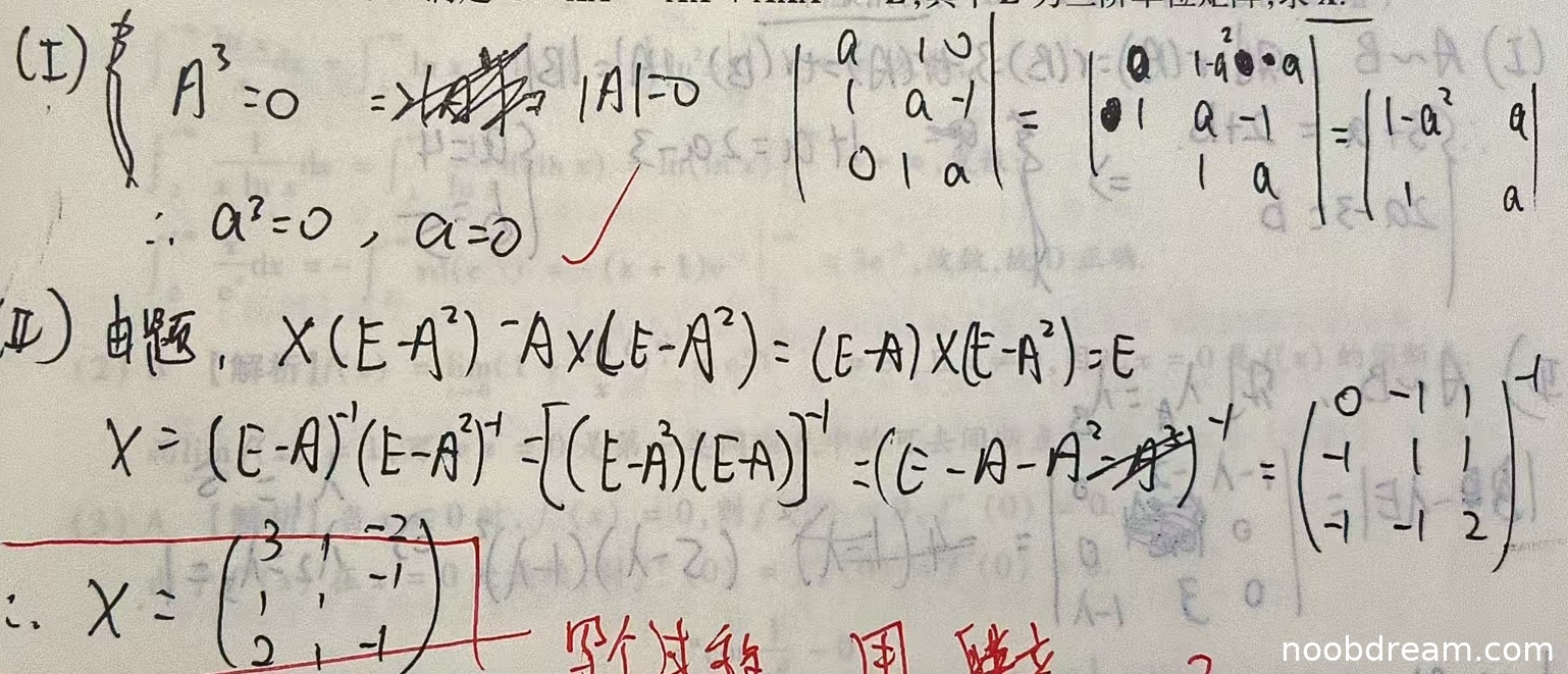 学生两次识别均正确推导出X=(E-A)⁻¹(E-A²)⁻¹,但后续化简错误:第一次识别中误写为(E-A)(E-A)(应为(E-A²)(E-A)),第二次识别中错误使用(E-A)(E+A)(不符合因式分解)。最终逆矩阵计算错误(结果矩阵数值错误)。但思路正确(因式分解求逆),扣3分(化简错误和计算结果错误),得2.5分。