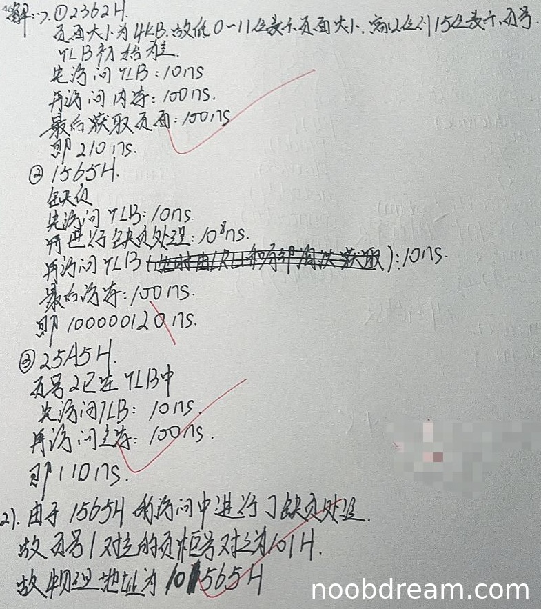 对于虚地址2362H的访问时间计算:学生第一次识别中写为210ns,第二次识别也为210ns,计算过程正确(10ns TLB未命中 + 100ns访问页表 + 100ns访问内存),得2分。