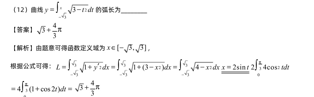 学生两次识别结果均为正确答案 \(\sqrt{3}+\frac{4}{3}\pi\),与标准答案完全一致。解析中详细给出了定义域确定、弧长公式应用、求导、积分换元以及计算过程,逻辑正确且计算无误。根据打分要求,正确则给满分5分。