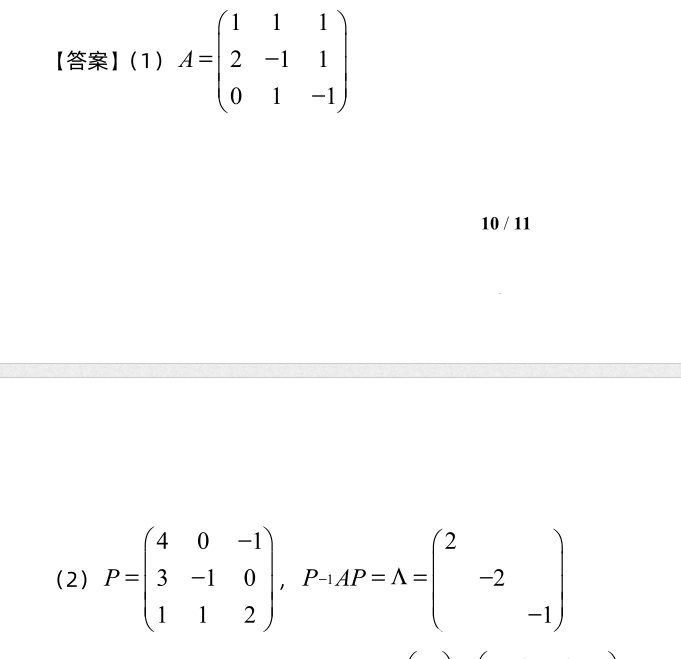 学生答案中给出了对角矩阵\(\Lambda=\begin{pmatrix}2&\\&-2\\&&-1\end{pmatrix}\),特征值正确(顺序与标准答案不同,但特征值集合相同,不影响对角化)。然而,矩阵P的列向量顺序与特征值顺序不匹配:标准答案中特征值顺序为-1、-2、2,而学生给出的P矩阵列向量顺序对应特征值2、-2、-1(第一列对应特征值2,第二列对应特征值-2,第三列对应特征值-1),但P的构造本身正确(列向量是特征向量)。虽然顺序不同,但\(P^{-1}AP\)仍为对角矩阵(只是对角线元素顺序不同),因此思路正确且结果等价。但学生答案中P的书写与标准答案顺序不一致(标准答案P为\(\begin{bmatrix}-1 & 0 & 4\\0 & 1 & 3\\2 & -1 & 1\end{bmatrix}\),学生答案为\(\begin{pmatrix}4&0&-1\\3&-1&0\\1&1&2\end{pmatrix}\)),实际上学生P矩阵的第一列是标准答案的第三列(特征值2的特征向量),第二列是标准答案的第二列(特征值-2的特征向量),第三列是标准答案的第一列(特征值-1的特征向量)。这种顺序差异不影响对角化,但严格来说,若要求P与Λ顺序完全一致,则此处有轻微瑕疵。然而,根据评分规则,思路正确不扣分,且识别结果可能存在误写(如数字顺序),因此不扣分。该部分得满分6分。