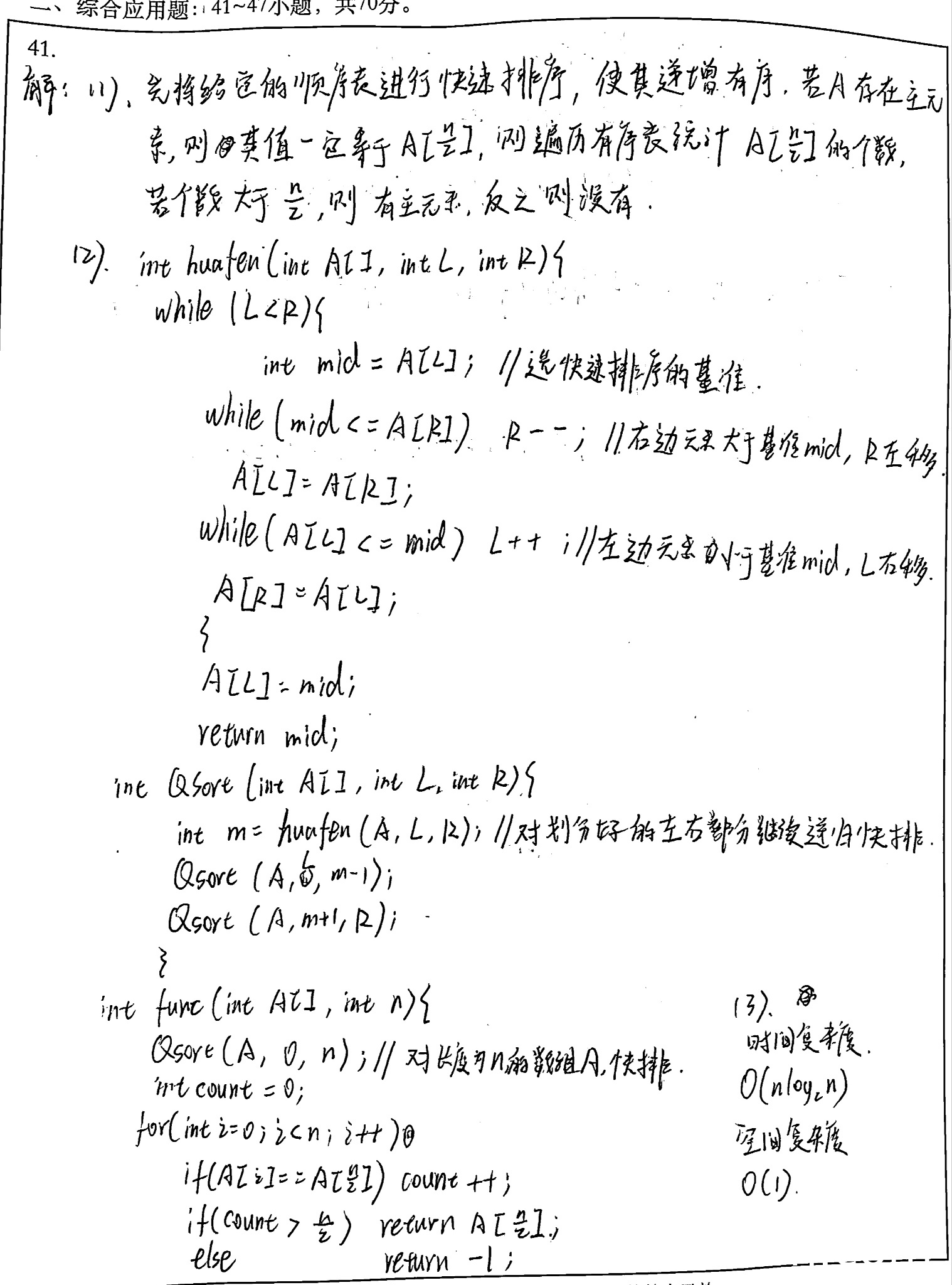 4. 统计次数的循环中,if(count > n/2) return A[n/2]; 和else return -1; 应放在循环结束后,而不是循环内部(否则第一次循环就会返回错误结果)。