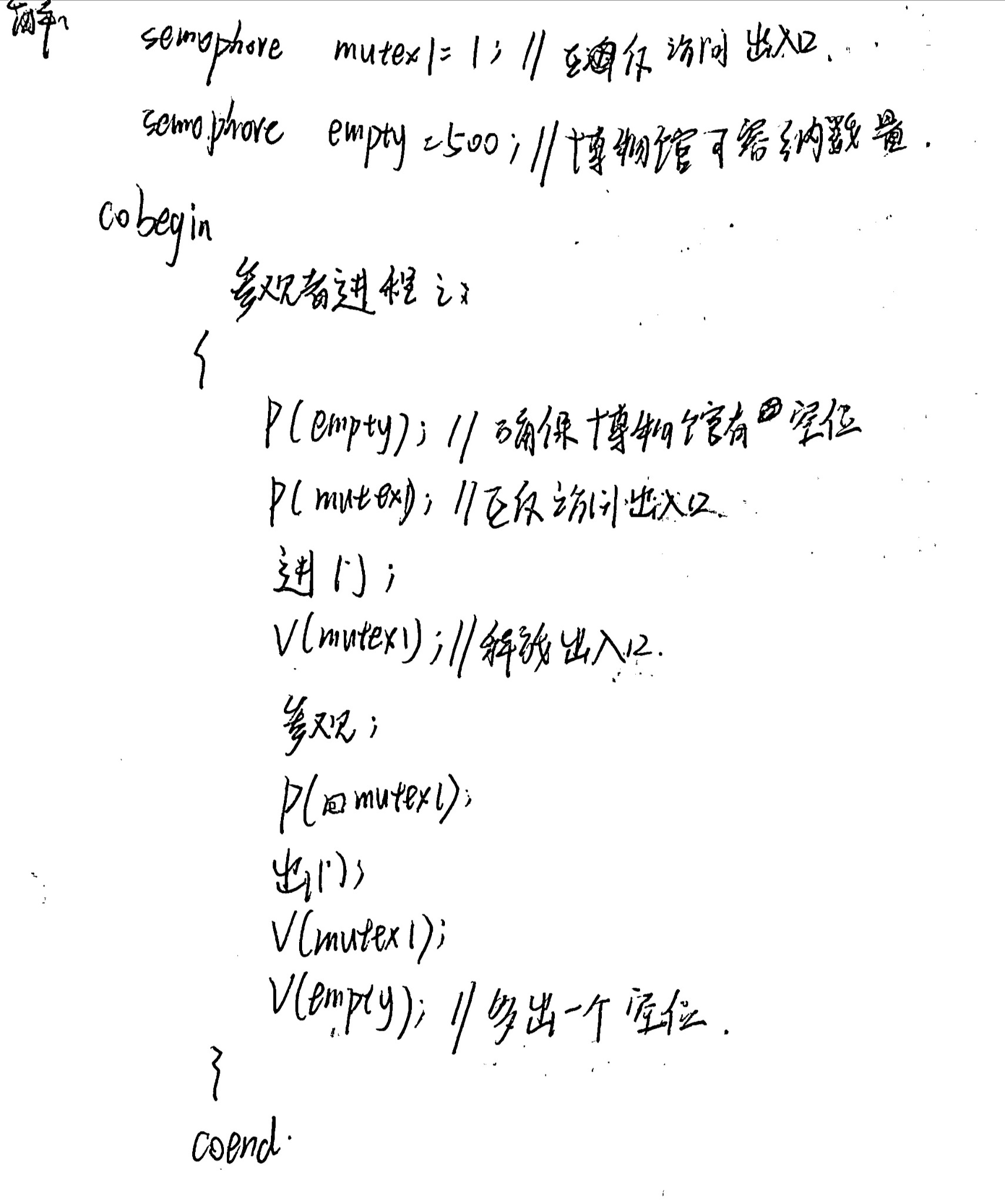 学生在进门前使用P(empty)检查是否有空位,出门后使用V(empty)释放空位,操作正确且位置合理(在互斥锁之外,避免不必要的阻塞)。因此得1分。