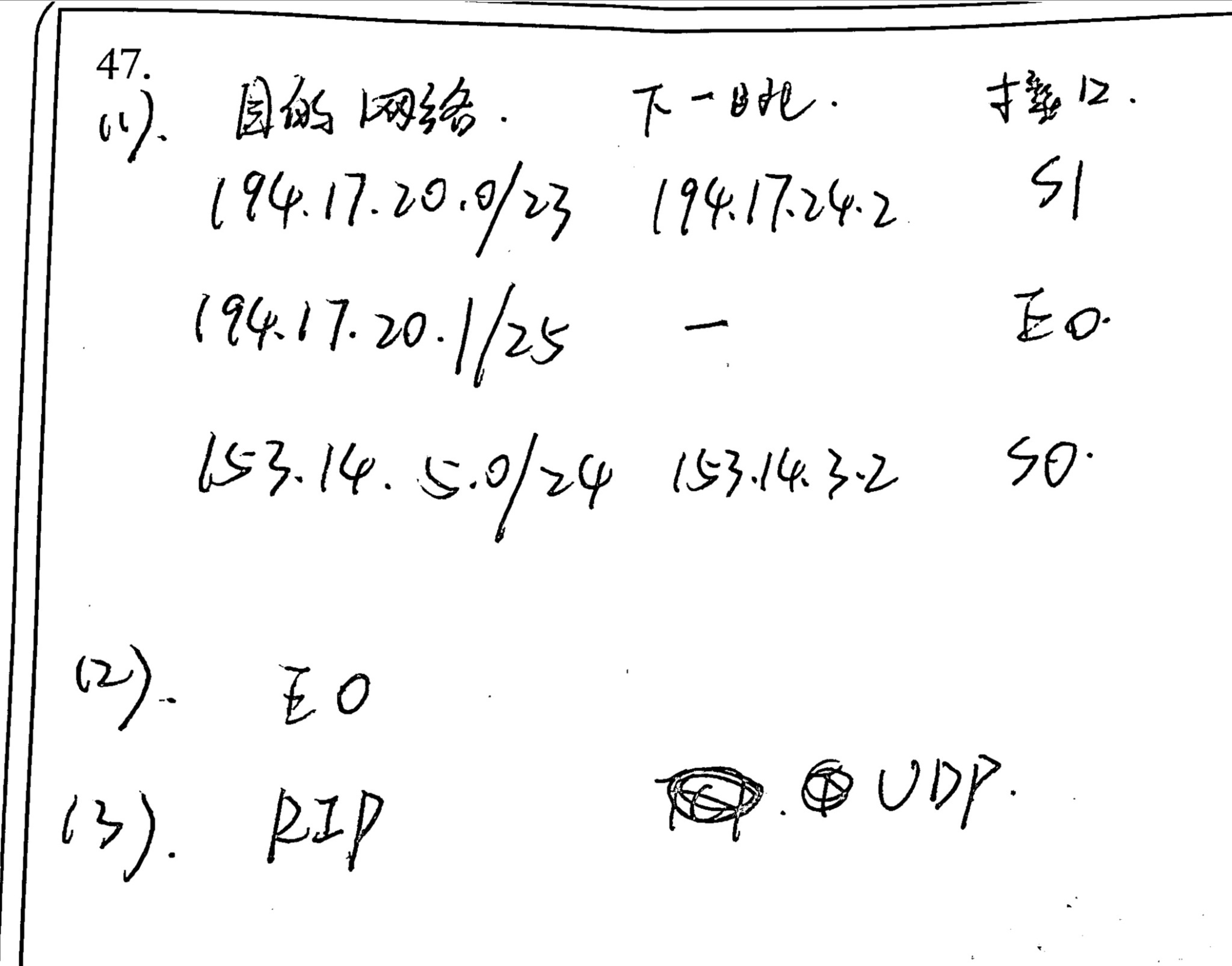 学生答案正确给出接口E0。目的IP地址194.17.20.200匹配194.17.20.128/25(学生误写为194.17.20.1/25,但根据上下文判断为误写,不扣分)和194.17.20.0/23,根据最长匹配原则,应通过E0转发。答案正确。