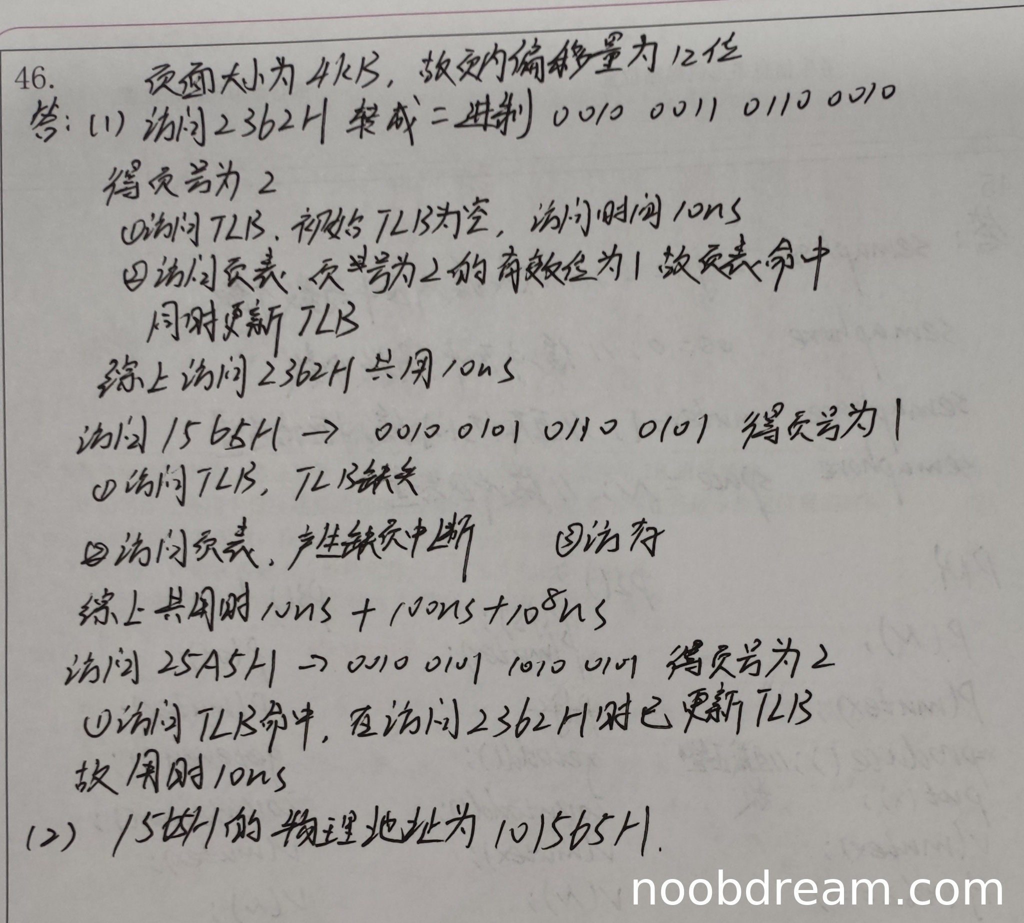 学生答案中给出了1565H的物理地址为101565H,与标准答案一致,且理由隐含在计算过程中(缺页中断后分配页框),因此正确。得2分。