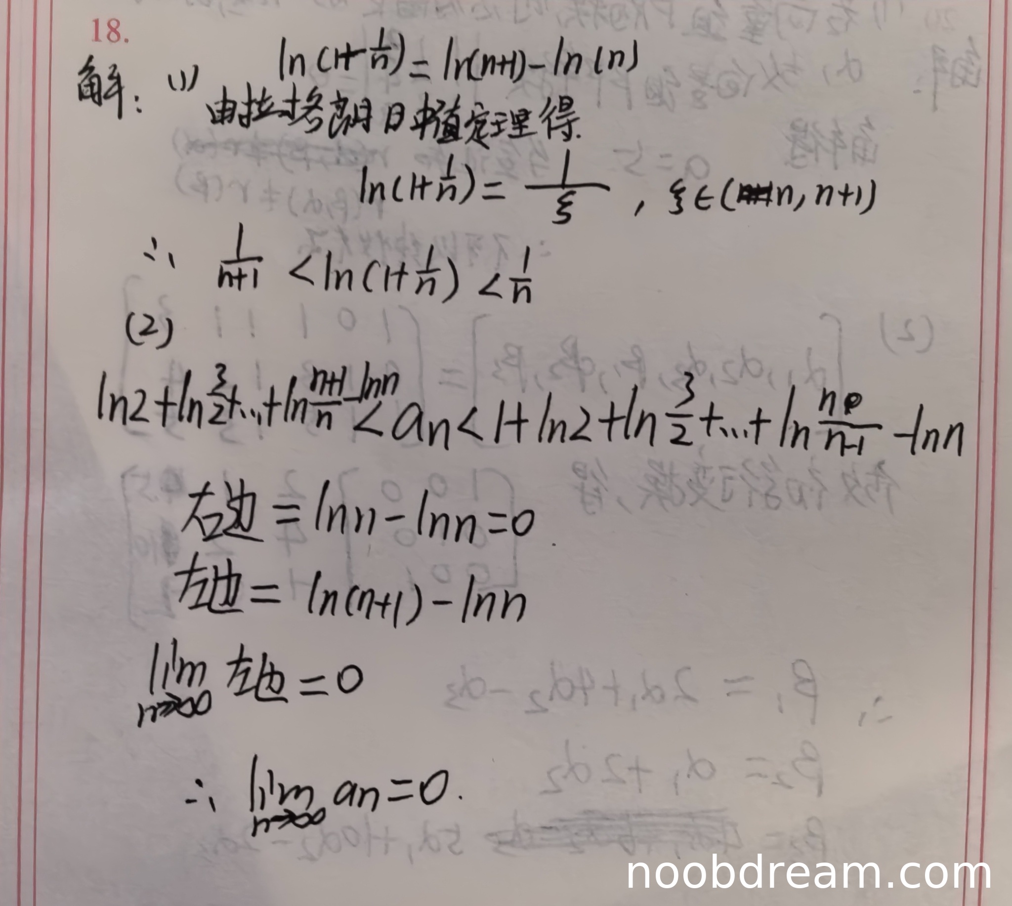 1. 右边表达式错误:标准答案中 \( a_n \) 的下界是通过不等式 \( \frac{1}{k} > \ln(1+\frac{1}{k}) \) 得到的,但学生直接写出了一个复杂的不等式链,且未说明来源。