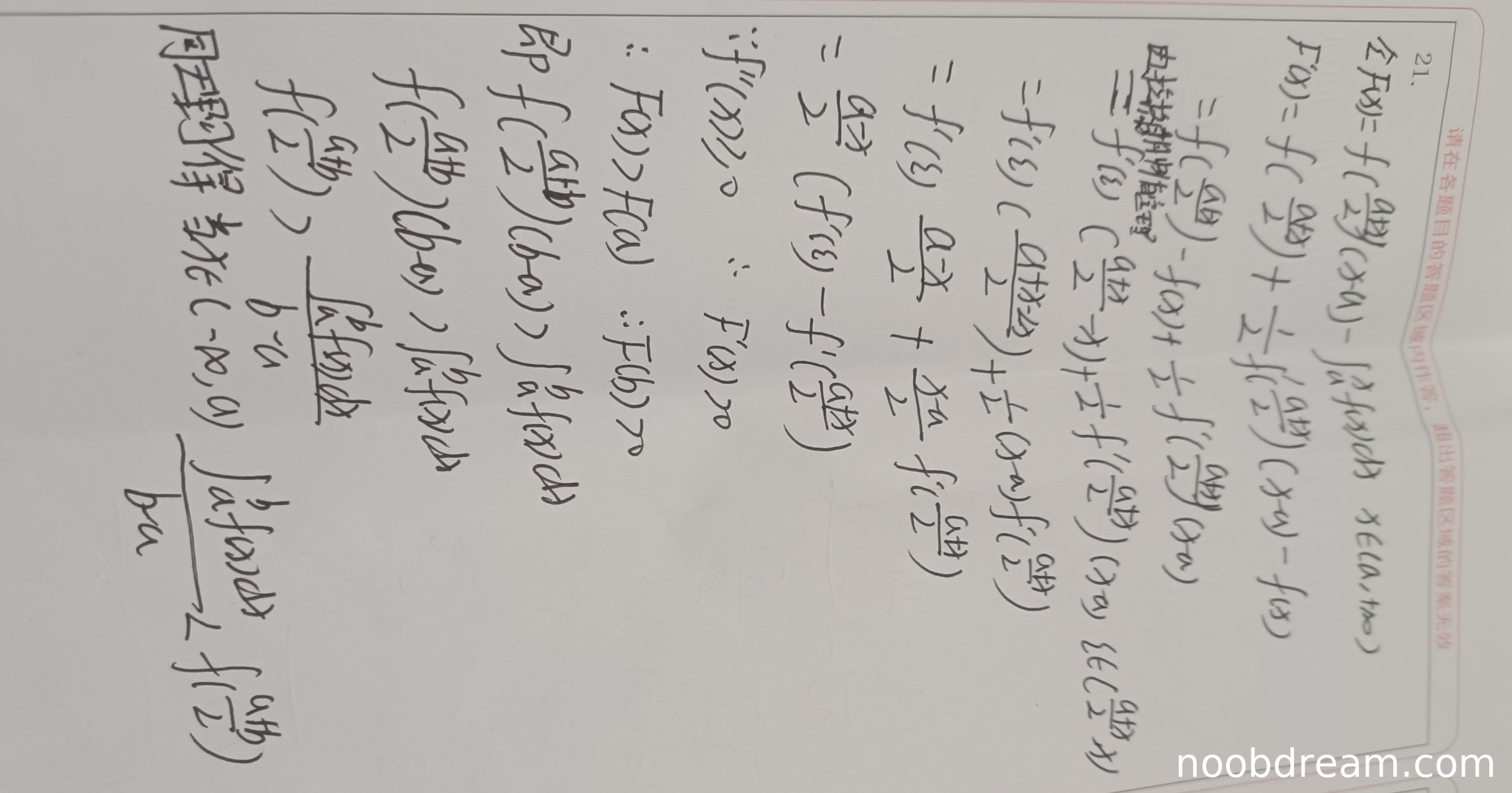 学生尝试证明必要性(即若 \(f''(x) \geq 0\) 则不等式成立),但证明过程存在严重逻辑错误。学生定义 \(F(x) = f\left(\frac{a+x}{2}\right)(x-a) - \int_a^x f(t) dt\),并计算 \(F(x)\) 的表达式,但推导中出现错误:使用积分中值定理 \(\int_a^x f(t) dt = f(\xi)(x-a)\) 后,后续代数变换混乱且不正确(如出现 \(f(\xi)\left(\frac{a+x}{2}-\xi\right)(x-a)\) 等项),导致表达式错误。最终得到 \(F(x) = \frac{a-x}{2}(f(\xi)-f(\frac{a+x}{2}))\) 这一错误结论,并错误地得出 \(F'(x) > 0\) 和 \(F(b) > 0\),从而推出 \(f\left(\frac{a+b}{2}\right) > \frac{1}{b-a} \int_a^b f(x) dx\),这与要证明的不等式方向相反。核心逻辑错误,且结论与必要性相反,故不得分。扣6分。