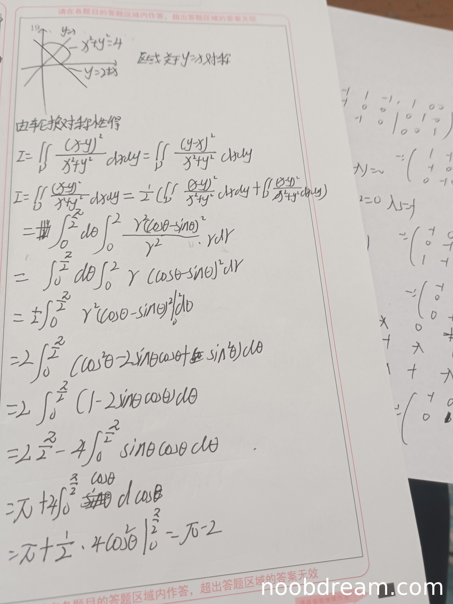 学生作答中,第一次识别结果存在逻辑错误:在利用轮换对称性时,错误地认为I等于两个相同积分的平均值(实际上轮换对称性直接得到I=I,没有化简作用),且后续计算只考虑了第一象限(θ从0到π/2),但区域D实际包含第一和第二象限(标准答案中θ从0到π),因此漏掉了第二象限部分(θ从π/2到π)的积分。此外,第一次识别中计算过程有误(如“π + 4∫... dcosθ”步骤错误),导致错误结果π-2(实际应为2π-2)。第二次识别结果同样只计算了第一象限(θ从0到π/2),忽略了第二象限部分,且未正确使用对称性(轮换对称性在此题中无效,因为被积函数和区域均不满足对称条件),但计算过程正确(仅针对第一象限部分)。整体上,学生作答未完整覆盖积分区域,且对称性使用不当,但第二次识别的计算步骤(针对第一象限)正确。根据标准答案,完整积分应为2π-2,而学生得到π-2(仅第一象限结果),因此扣除区域遗漏和对称性错误的分数。扣分:区域遗漏(第二象限)扣6分,对称性错误扣2分,计算错误(第一次识别)已避免(以第二次识别为准),但第二次识别计算部分正确给部分分。最终得分:12 - 6(区域遗漏) - 2(对称性错误) = 4分。
