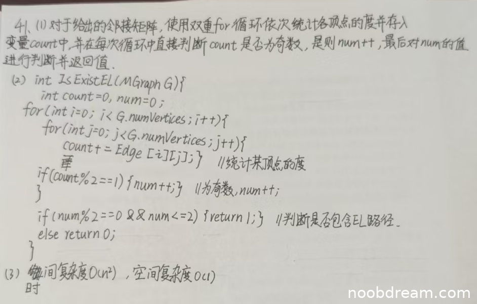 此外,条件判断“num % 2 == 0 && num <= 2”正确,但代码未处理连通性(题目要求无向连通图,但标准答案未要求检查连通性,故不扣分)。以上错误每处扣2分,共扣4分。