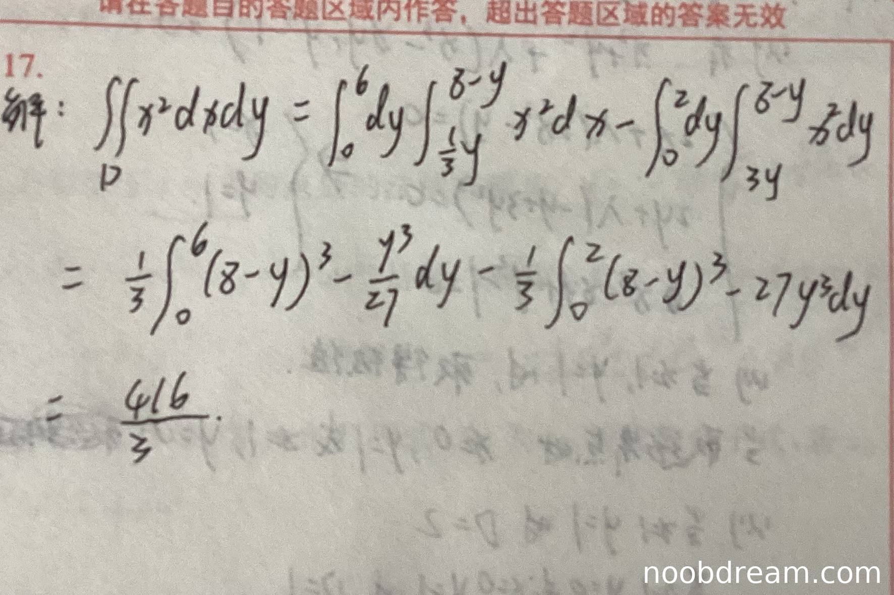 尽管学生的方法与标准答案(先对y积分再对x积分)不同,但依据打分要求第3条“思路正确不扣分”,且无逻辑错误,因此不扣分。识别结果中虽有少量字符误写(如第一次识别中“dy”误写为“dy”但上下文明确为dx),但根据禁止扣分第1、4条,不视为错误。