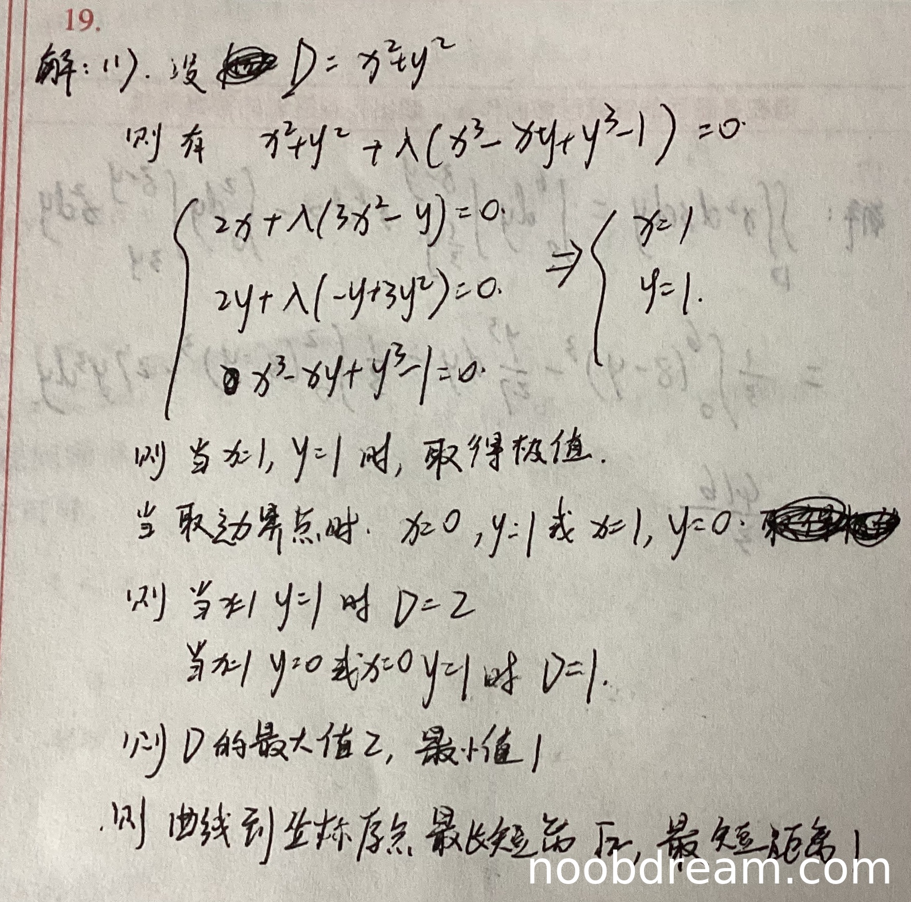 - 拉格朗日函数写为 \(x^2 + y^2 + \lambda(x^3 - xy + y^3 - 1) = 0\) 是错误的(应为等于 \(L\),但这是表述问题,实际使用正确,不扣分)。