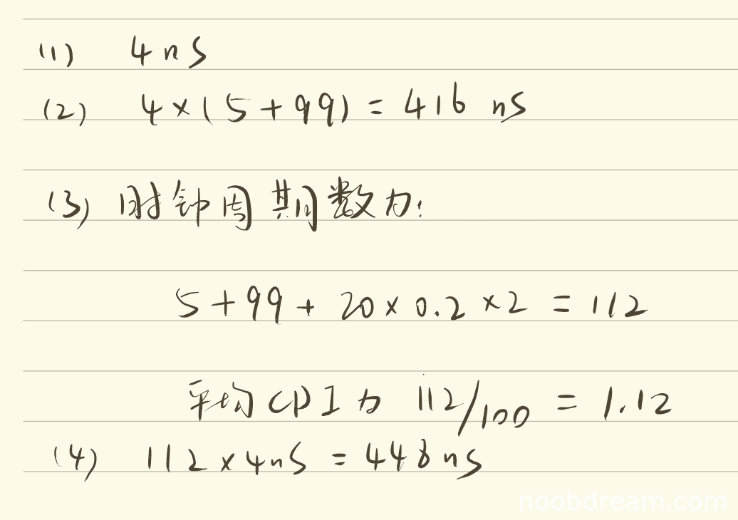 学生答案:112×4ns = 448ns。该计算基于(3)中错误的总周期数112,但计算过程正确(周期数×时钟周期时间)。因(3)部分错误导致此处结果错误,但本步骤无独立逻辑错误。扣2分(依赖前问错误数据)。得2分。