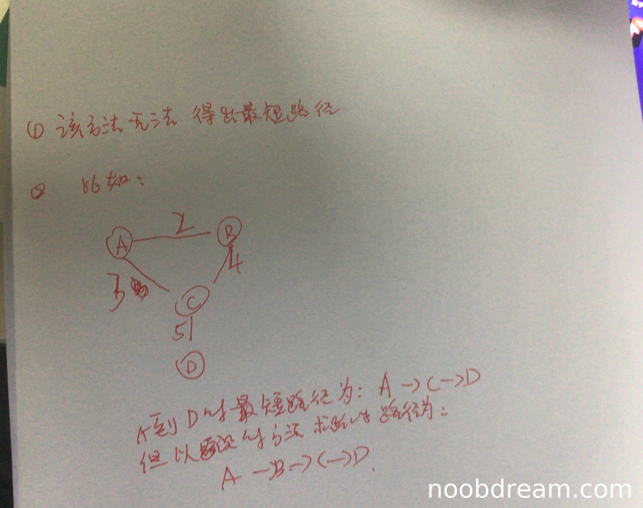 学生回答指出该方法无法得出最短路径,并举例说明,与标准答案一致。虽然两次识别的具体图例与标准答案不完全相同(第一次识别未给出边权值,第二次识别给出了边权值但图结构不同),但核心逻辑正确:该方法(贪心策略)不能保证得到全局最短路径,因为局部最优选择可能错过全局更优路径。因此,学生回答正确,得10分。