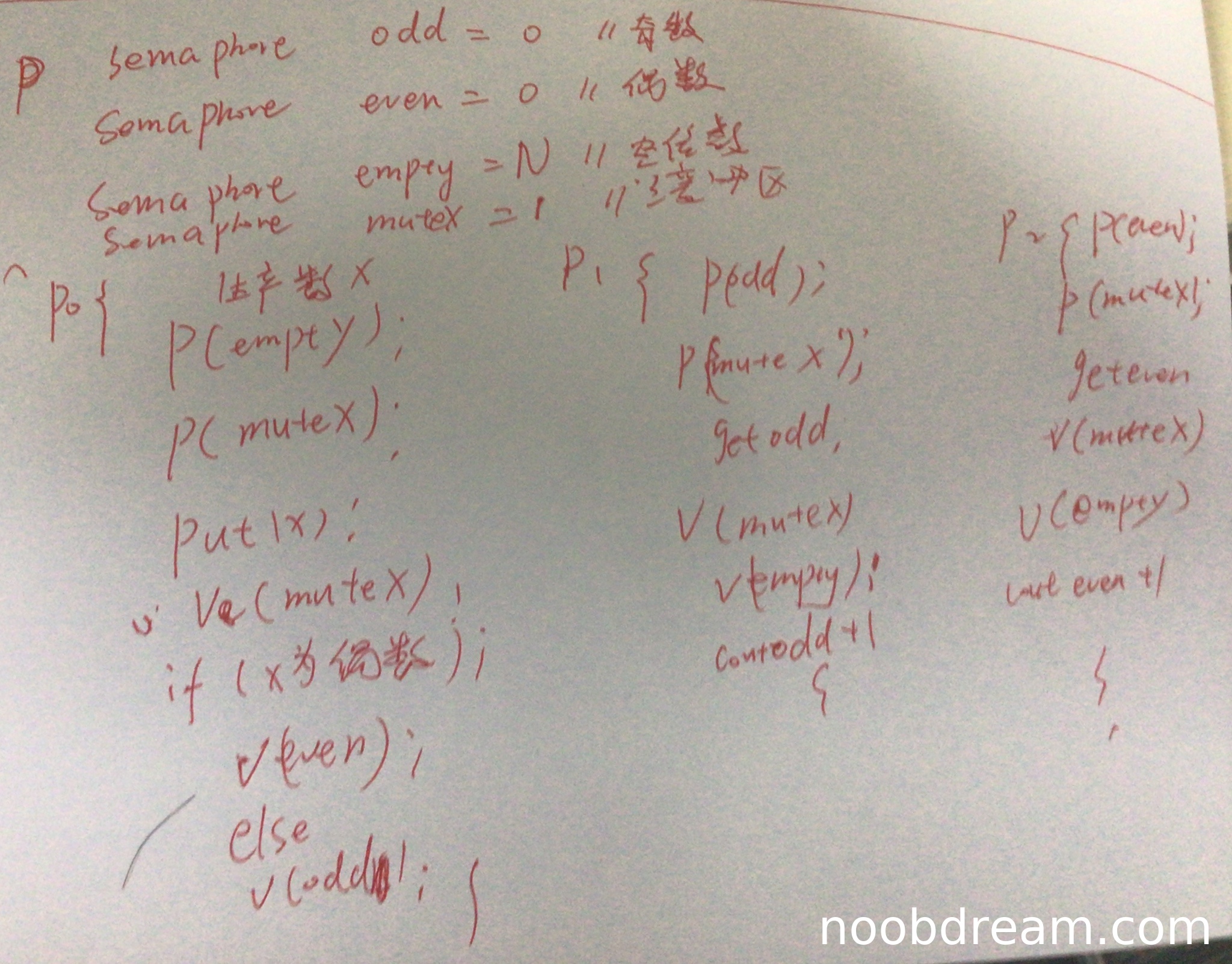 理由:学生定义了四个信号量(odd、even、empty、mutex),含义与标准答案完全一致(odd控制P1与P2同步,even控制P1与P3同步,empty控制缓冲区空单元,mutex控制互斥)。信号量初始值正确(odd=0, even=0, empty=N, mutex=1)。