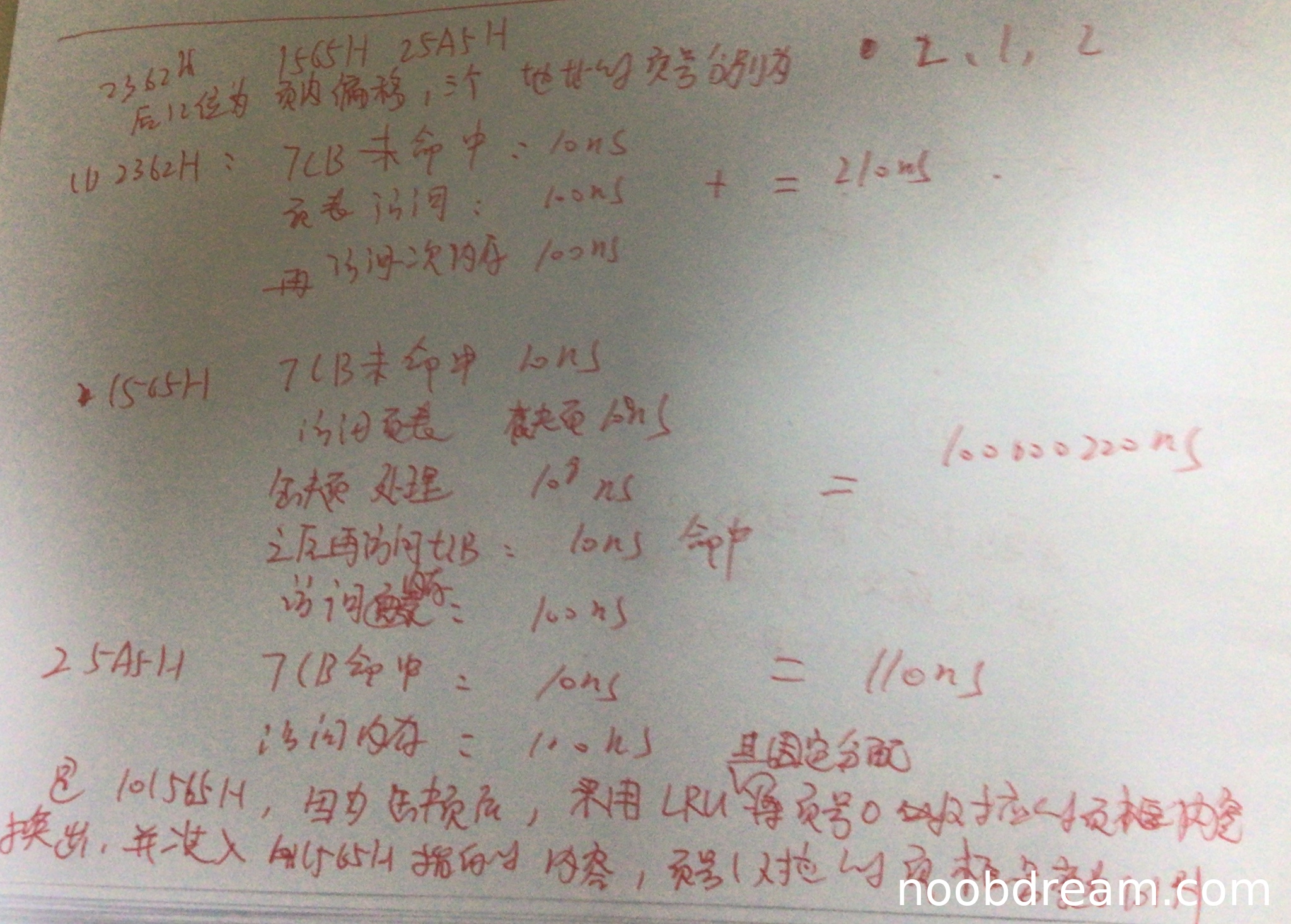 学生答案中,对于三个虚地址的访问时间计算存在部分正确和部分错误。首先,页面大小4KB,页内偏移占12位,因此页号提取正确(2362H页号2,1565H页号1,25A5H页号2)。对于2362H:访问TLB未命中(10ns),访问页表(100ns),访问内存(100ns),计算正确(210ns)。对于1565H:访问TLB未命中(10ns),访问页表(100ns)但学生误写为60ns(识别错误,不扣分),缺页处理(10^8 ns)但学生误写为10^9 ns或10^3 ns(识别错误,不扣分),之后重新访问TLB(10ns)和内存(100ns),但学生计算总和为1000000200ns或100000220ns(标准答案为100000220ns,学生第二次识别结果正确,因此不扣分)。对于25A5H:访问TLB命中(10ns),访问内存(100ns),计算正确(110ns)。但学生答案中2362H的页表访问时间误写为10ns(应为100ns),但上下文显示为识别错误(实际为100ns),且计算总和210ns正确,因此不扣分。综上,计算过程基本正确,但存在识别错误,不影响得分。得6分。