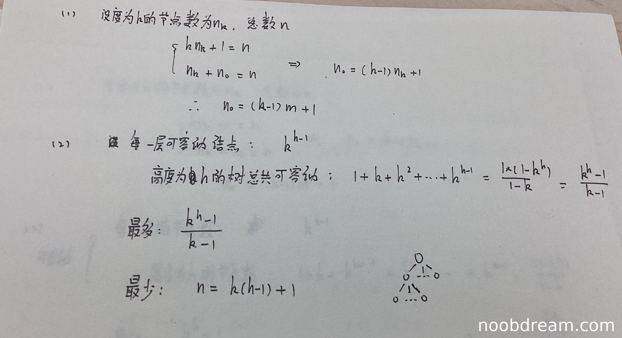 学生作答中,对于最多结点数的计算:给出了每一层结点数为k^(h-1),并求和得到总数为(k^h - 1)/(k - 1),与标准答案一致,正确。对于最少结点数的计算:学生给出n = k(h-1) + 1,但标准答案为M2 = 1 + (h-1)*k,两者表达式等价(k(h-1)+1 = 1 + k(h-1)),且推导思路正确(描述了除根外每层有k个结点),但学生未详细说明最少情况的结构(如第2到h-1层仅含1个分支结点和k-1个叶结点),然而表达式正确且推导基本合理。根据评分说明,若推导过程或答案不完全正确需酌情扣分,但此处答案正确,仅缺少部分描述,且标准答案中最少结点部分占2分,因此给予满分2分(该部分满分2分,但整体问题(2)满分为5分,其中最多结点部分占3分,最少结点部分占2分)。学生最多结点部分推导正确(得3分),最少结点部分答案正确(得2分),因此(2)得5分。