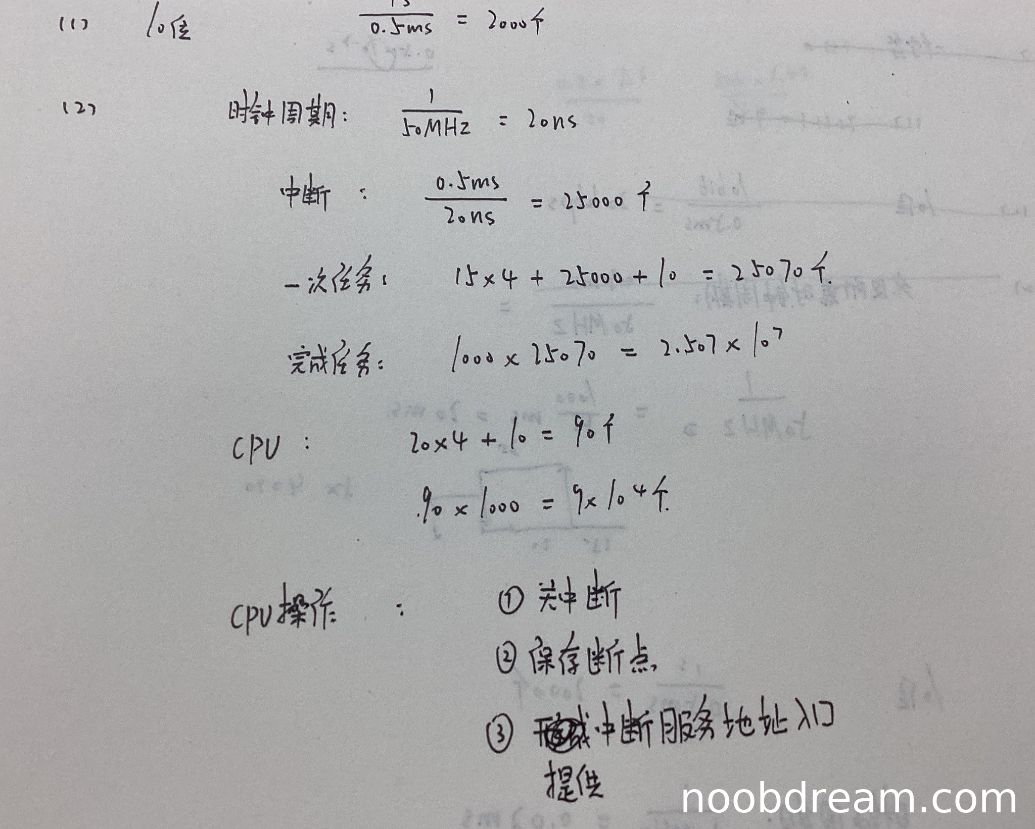 学生计算了时钟周期(20ns)、中断等待时间(25000个时钟周期)、一次任务时间(25070个时钟周期)、完成任务总时间(2.507×10^7个时钟周期)以及CPU时间(9×10^4个时钟周期),所有计算均正确,与标准答案一致。中断响应阶段操作回答正确(关中断、保存断点、形成中断服务地址入口,与标准答案“识别中断源”含义一致)。因此,第二问全部正确,得6分。