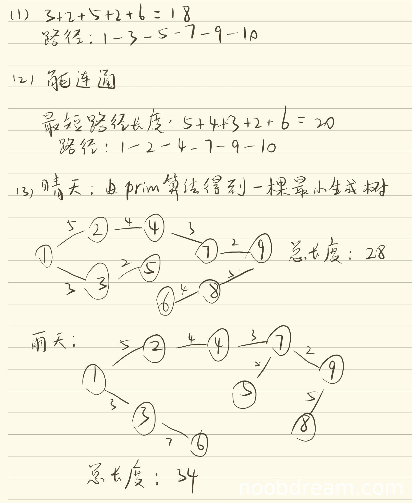 学生正确判断雨天所有城市能连通,最短路径长度计算为20,路径为1-2-4-7-9-10,与标准答案完全一致。虽然未写出Dijkstra算法步骤,但结果正确,因此得3分。