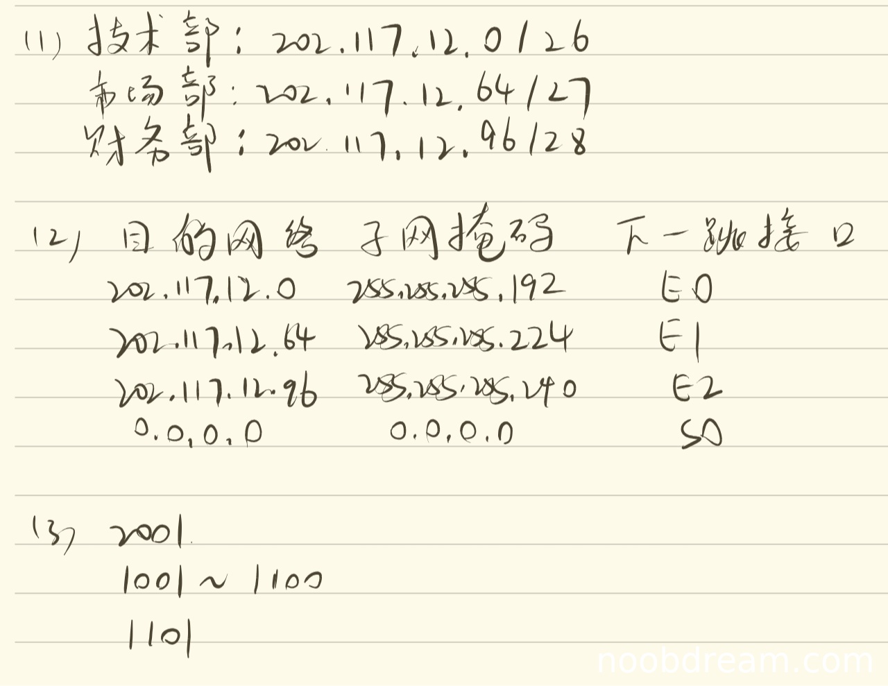 学生答案中技术部子网为202.117.12.0/26,市场部为202.117.12.64/27,财务部为202.117.12.96/28,与标准答案完全一致。子网划分正确,网络地址和子网掩码(通过CIDR表示隐含)均正确。得3分。