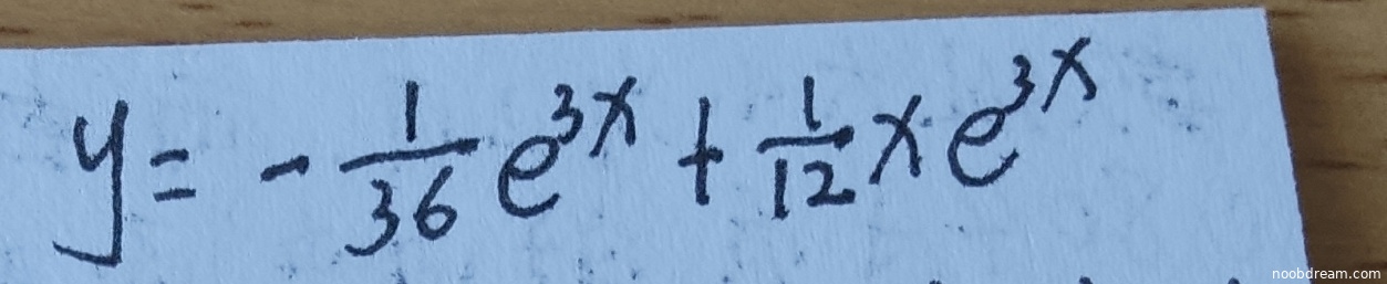 学生作答的两次识别结果均为 \(y = -\frac{1}{36}e^{3x} + \frac{1}{12}xe^{3x}\),而标准答案为 \(y(x) = \frac{1}{12}(xe^{3x} - \frac{1}{3}e^{3x})\)。将学生答案化简:\(-\frac{1}{36}e^{3x} + \frac{1}{12}xe^{3x} = \frac{1}{12}xe^{3x} - \frac{1}{36}e^{3x} = \frac{1}{12}(xe^{3x} - \frac{1}{3}e^{3x})\),与标准答案完全一致。因此,学生答案正确,得5分。