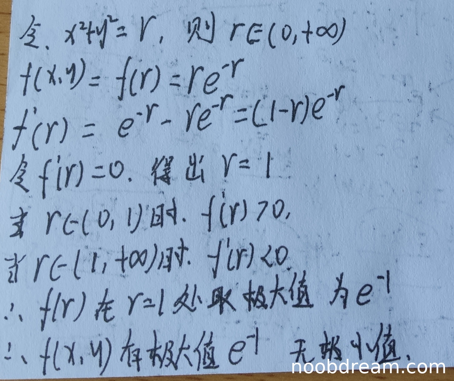 学生作答通过变量代换 \( r = x^2 + y^2 \) 将二元函数转化为一元函数 \( f(r) = r e^{-r} \),然后求导并分析单调性,得出在 \( r=1 \) 时取得极大值 \( e^{-1} \)。这种方法思路正确,且计算过程无误,找到了函数的极大值。