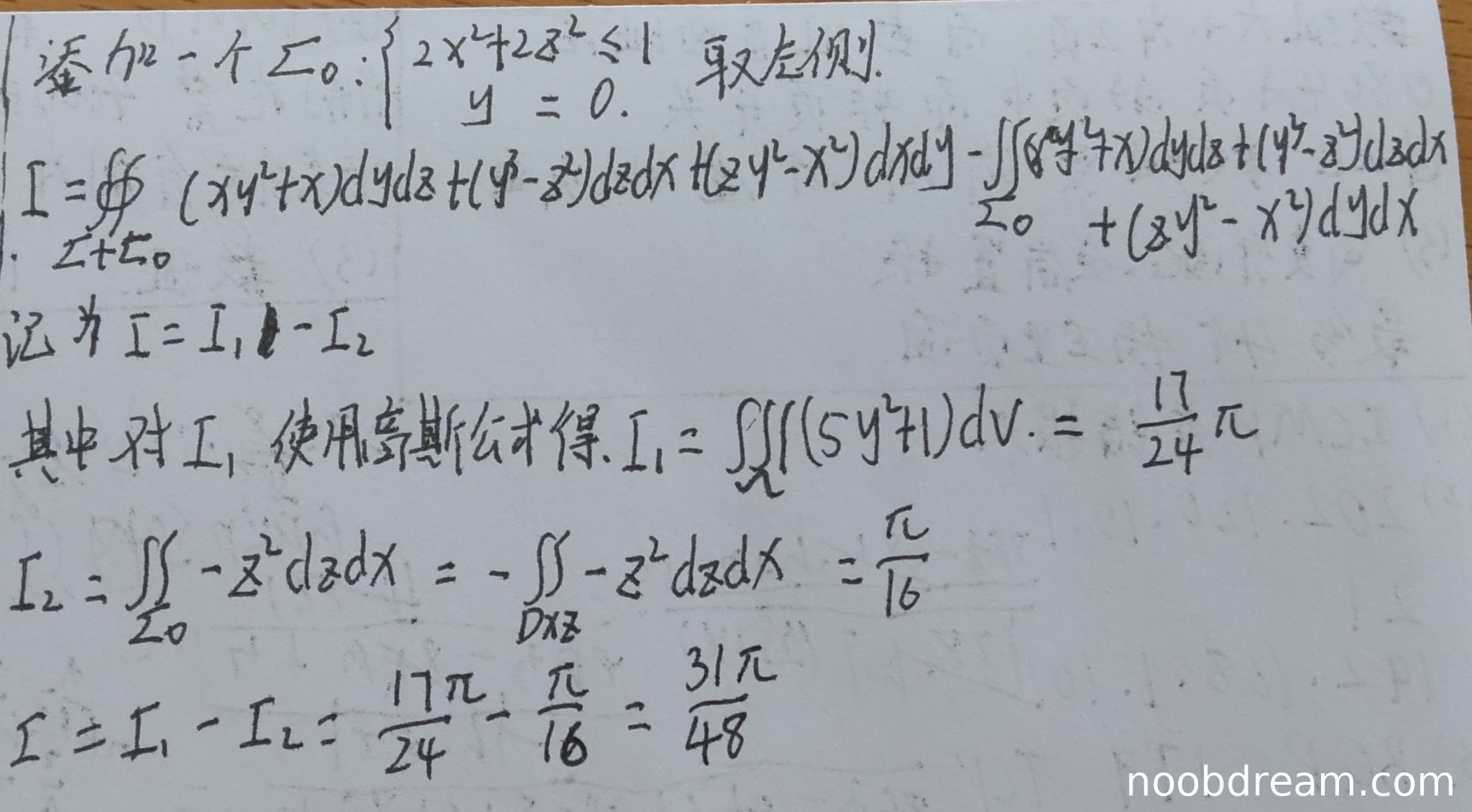 学生补充曲面Σ₀: y=0 (2x²+2z²≤1) 取左侧,与标准答案(x²+z²≤1/2)等价(因2x²+2z²≤1即x²+z²≤1/2),且方向正确。得2分。