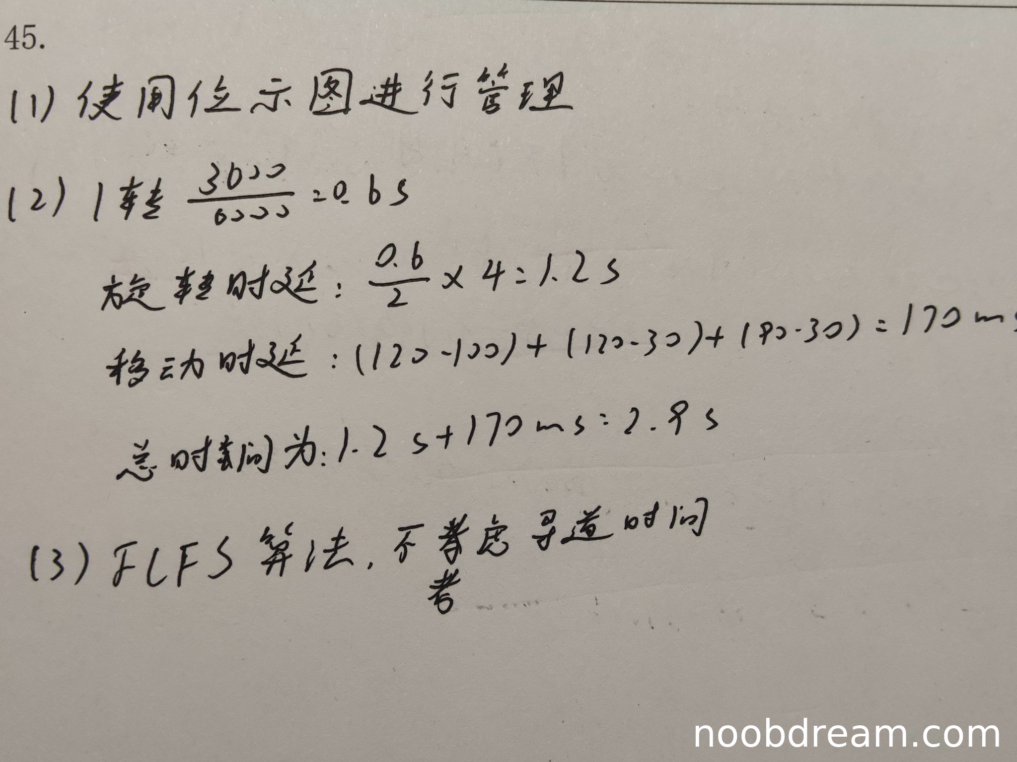 - 移动时延计算:学生计算了移动磁道数170ms(正确),但总时间计算错误(1.2s+170ms=1370ms,而非2.9s)。