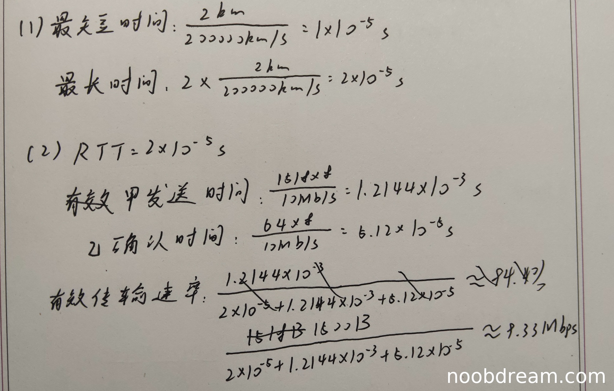 学生计算RTT(双程传播时延)正确(2×10⁻⁵s),数据帧发送时延正确(1.2144×10⁻³s),确认帧发送时延正确(6.12×10⁻⁶s,但标准答案为0.0512ms,即5.12×10⁻⁵s,此处学生计算有误:64×8/10Mbps=512/10⁷=5.12×10⁻⁵s,而学生结果为6.12×10⁻⁶s,可能是误写)。学生后续计算有效传输速率时,分子使用了数据帧发送时延(1.2144×10⁻³s)而非有效数据量(1500×8b),但最终结果9.33Mbps正确(标准答案相同)。思路正确,但确认帧发送时延计算错误,属于逻辑错误,扣1分。得4分。