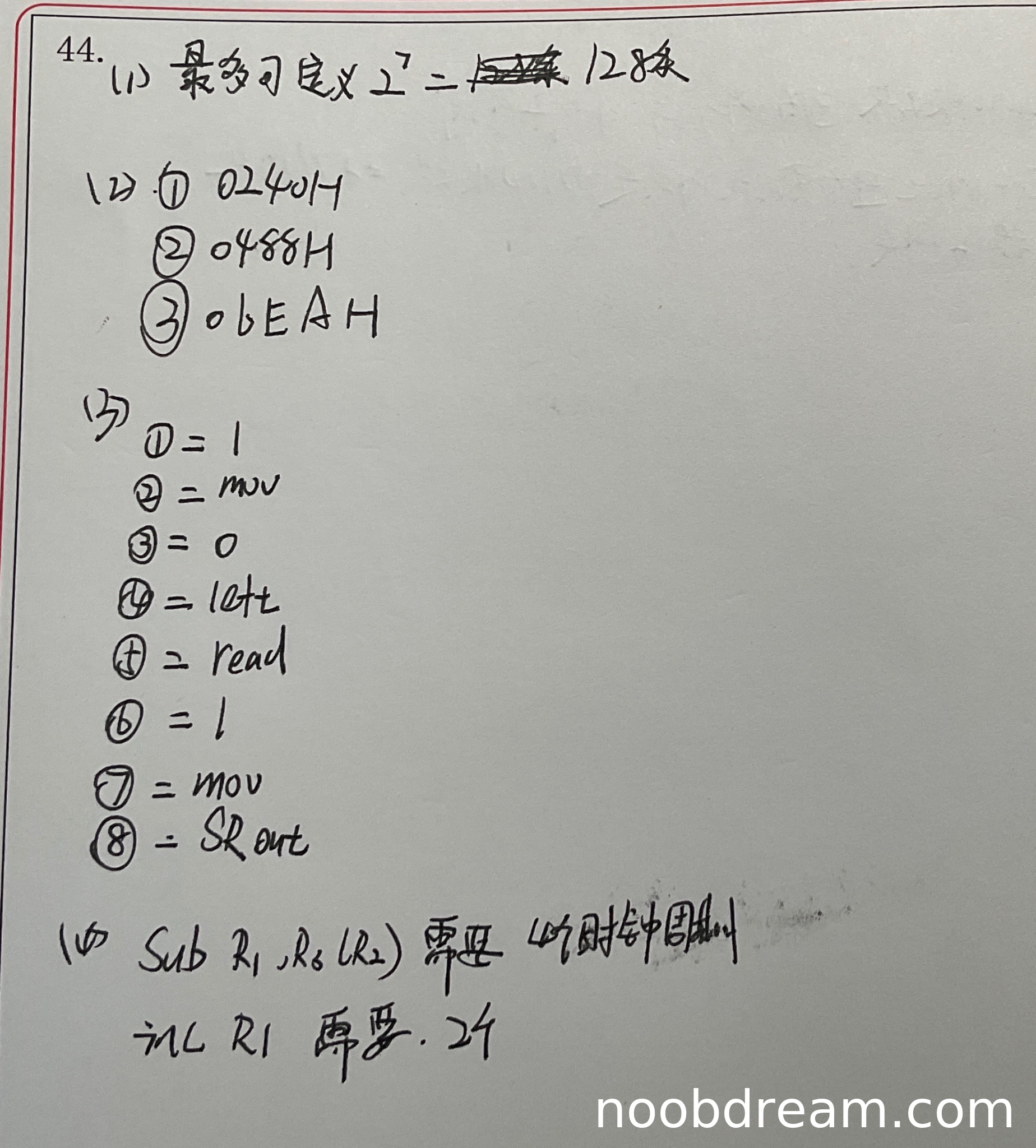 - sub R3, (R1), R2的机器码第一次识别为0bEAH(应为06EAH),第二次识别为0BEAH(应为06EAH),但十六进制中B和6在部分字体中可能混淆,结合上下文判断为误写(将6误识别为B),逻辑正确,不扣分。
