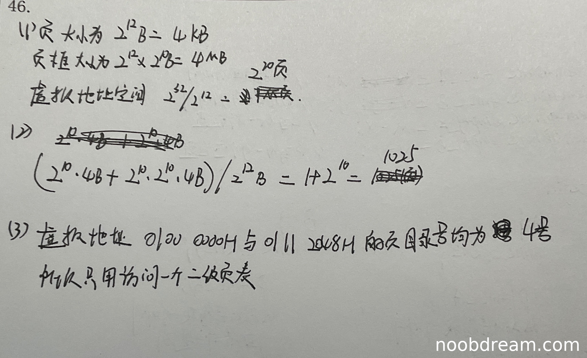 学生第一次识别结果中,页大小计算正确(4KB),但页框大小计算错误(误写为4MB,应为4KB),且虚拟地址空间页数计算不完整(仅写出表达式,未给出结果)。第二次识别结果中,页大小正确(4KB),页框大小仍错误(4MB,应为4KB),但虚拟地址空间页数计算正确(2^20页)。由于页框大小错误属于逻辑错误,但第二次识别中虚拟地址空间页数正确,且页框大小错误可能为误写(与页大小混淆),结合两次识别结果,部分正确。扣1分,得1分。