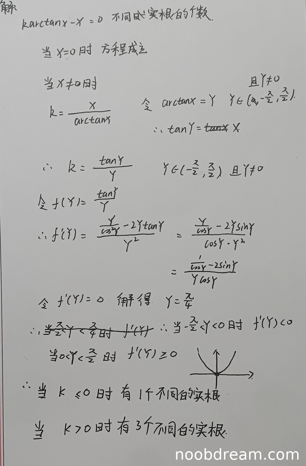 - 根个数结论错误:学生得出 \(k \leq 0\) 时只有1个根(正确),但 \(k>0\) 时有3个根(错误,实际应为2个根)。标准答案通过分析原函数 \(f(x)=k\arctan x - x\) 的单调性和极值,正确得到 \(k>1\) 时2个根、\(k \leq 1\) 时1个根。学生方法(参数化 \(k=\frac{\tan y}{y}\))虽思路不同,但执行错误,导致错误结论。