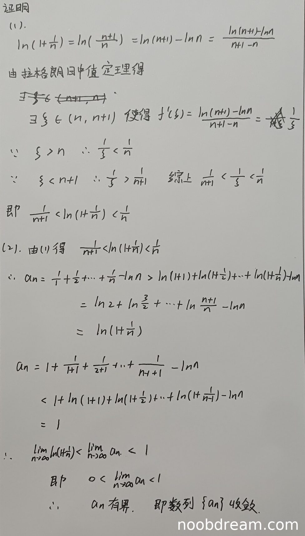 学生使用拉格朗日中值定理证明不等式,思路正确且完整。具体地,令f(x)=ln x,在区间[n, n+1]上应用拉格朗日中值定理,得到存在ξ∈(n, n+1)使得f'(ξ)=1/ξ=(ln(n+1)-ln n)/((n+1)-n),进而由n<ξ (2)得分及理由(满分5分) 学生证明数列收敛时存在逻辑错误。首先,在证明单调性时,学生未说明a_{n+1}-a_n的符号(应为负,由(1)中ln(1+1/n)>1/(n+1)可得a_{n+1}-a_n<0,即单调递减),但学生直接跳过了这一关键步骤。其次,在证明有下界时,学生写出a_n > ln(1+1/n)(实际上应为a_n > ln(n+1)-ln n = ln(1+1/n)),但ln(1+1/n)随n增大趋于0,不能直接说明a_n有下界(大于0只是下界的一部分,但需说明下界固定)。学生进一步写出a_n < 1,但推导有误:学生写a_n = 1 + 1/2 + ... + 1/(n+1) - ln n(识别中为"1 + 1/(1+1) + 1/(2+1) + ... + 1/(n+1) - ln n",即从1/2加到1/(n+1)),这实际上不是a_n的定义(a_n应是从1/1加到1/n),此处可能是识别错误或笔误,但导致逻辑错误。学生试图用放缩得到a_n < 1,但步骤错误(例如,用ln(1+1/k) < 1/k放缩求和,但未正确叠加)。最后,学生错误地写出lim_{n→∞} ln(1+1/n) < lim_{n→∞} a_n < 1,并得出有界性,但极限存在性未证明(收敛性需由单调有界定理保证,但学生未证明单调性,且下界论证不严谨)。因此,本部分存在多处逻辑错误,扣3分,得2分。 题目总分:5+2=7分