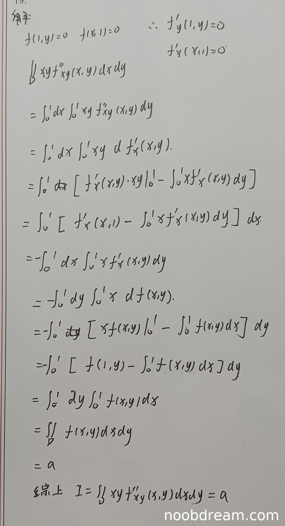 学生作答的两次识别结果均正确。第一次识别中出现了"xy + f''_{xy}"的误写(应为"xy f''_{xy}"),但根据上下文可判断为识别错误,且后续步骤正确,故不扣分。第二次识别完全正确。解题过程与标准答案思路一致:先对y分部积分(第一次识别中先对x积分,但本质相同),利用边界条件简化,再对x分部积分,最终化为已知的二重积分a。逻辑严谨,计算无误。